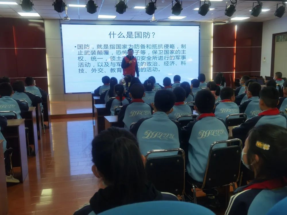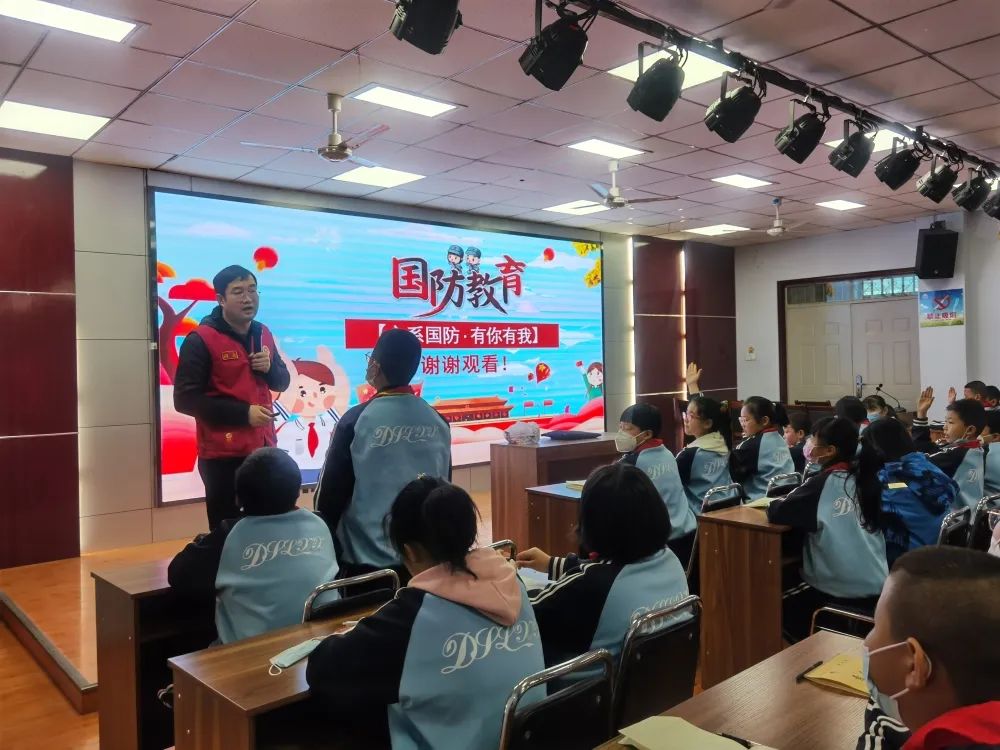活动中,志愿者宿磊以PPT的方式,声情并茂地为师生们讲解了“国防是什么”“国防教育的意义是什么”“人民解放军有哪些军种”“人民解放军现代化军事装备知识”四个方面的内容,引导同学们要认识到国防建设的重要性和紧迫性,坚决担负起未来保卫祖国的历史使命,真正成为爱党、爱国、奋进自强、勇于担当的新时代好少年。