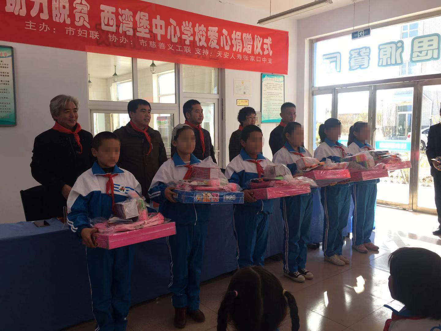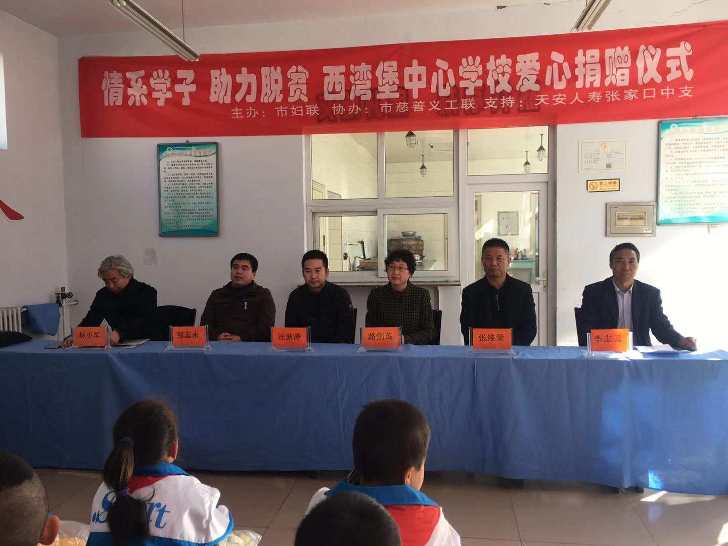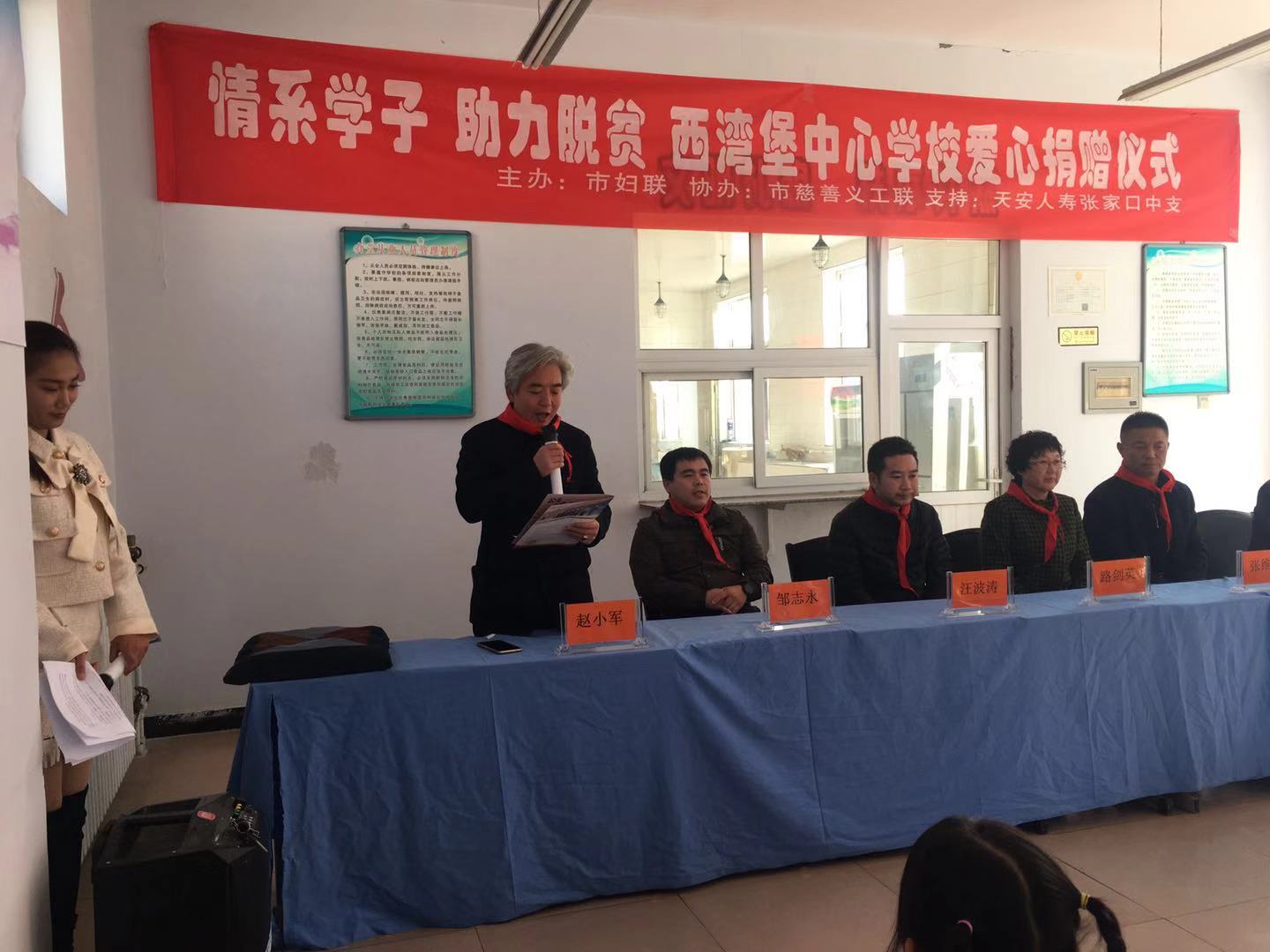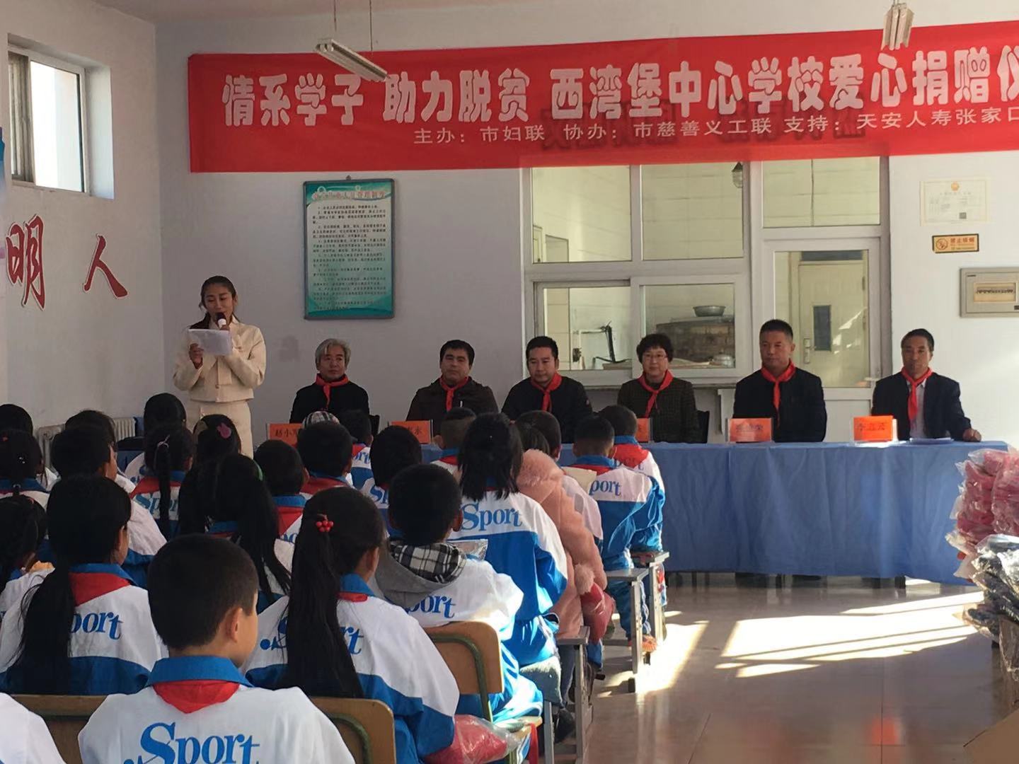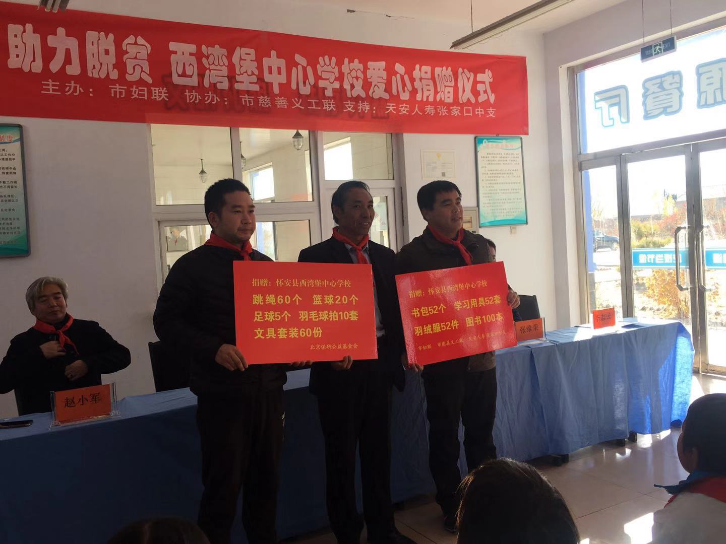 2018年10月24日,由张家口市妇女联合会主办,张家口慈善义工联合会协办,天安人寿张家口中支,北京保研公益基金会支持的“情系学子 助力脱贫 西湾堡中心学校爱心捐赠仪式”在张家口市怀安县西湾堡中心学校开展。此次活动由天安人寿张家口中支为西湾堡中心学校全体学生捐赠了书包52个、学习用具52套、保温杯52个、羽绒服52件、图书100本。北京保研公益基金会捐赠了跳绳60个、篮球20个、 足球5个、羽毛球拍10套、 文具套装60份。这些物资的捐赠和富有创意的心理活动开展,不仅给学生们带来了实实在在的物质帮助,更重要的是带来了巨大的精神动力,必将温暖这里的每一颗心灵,浸润每一块心田。