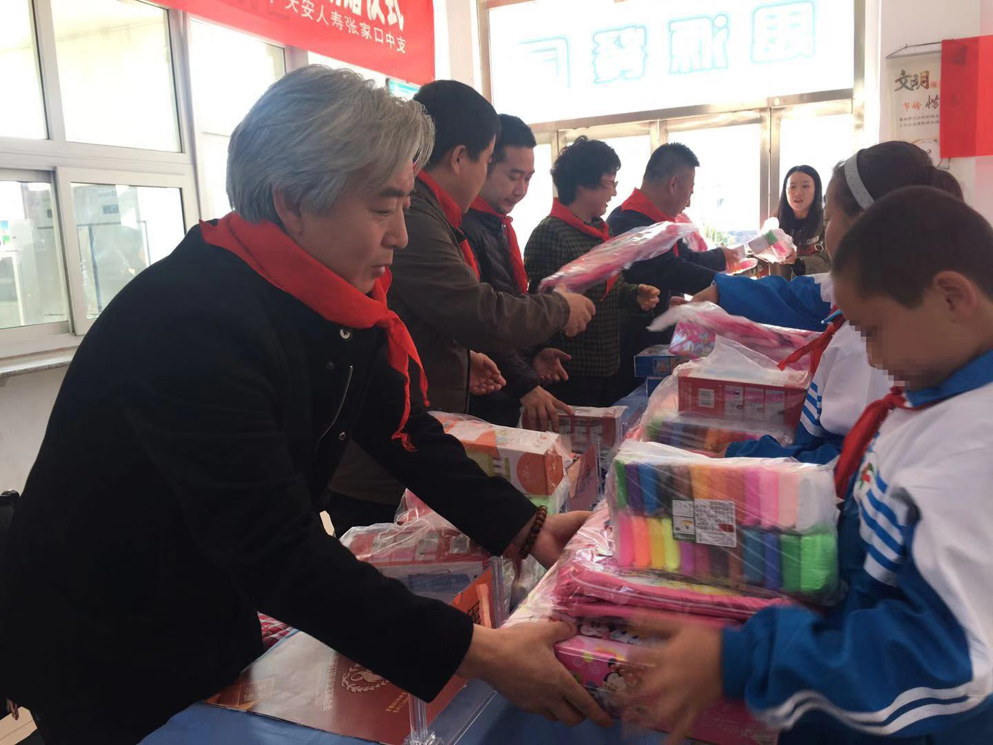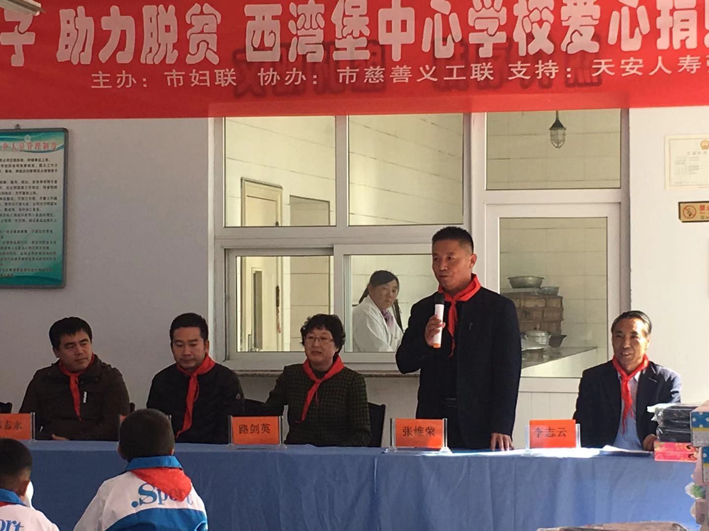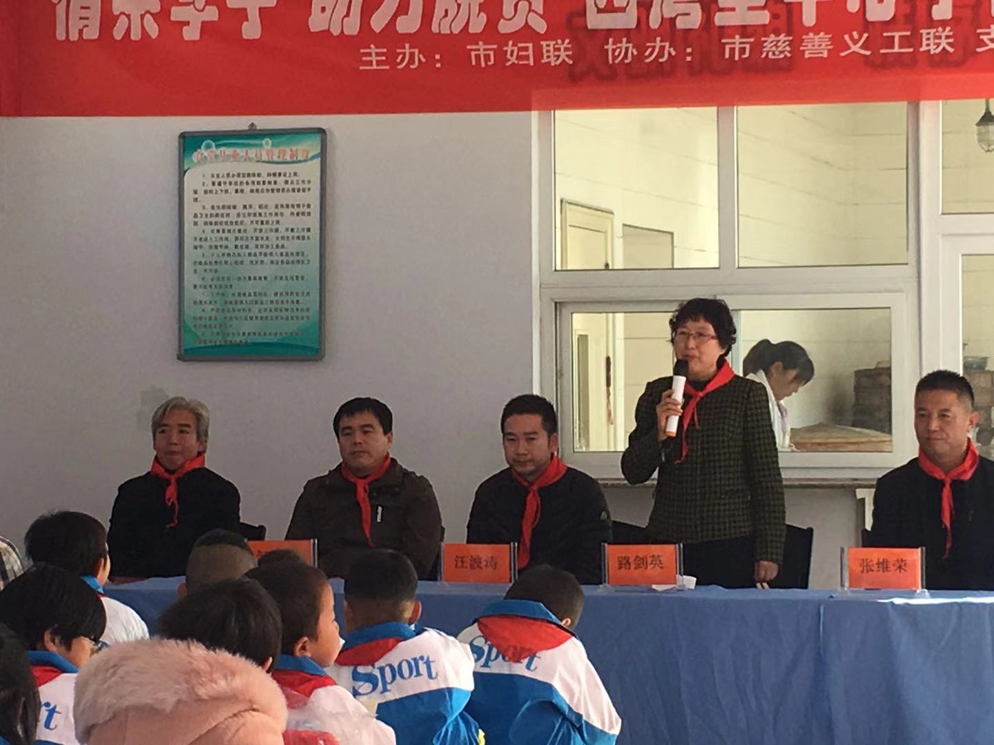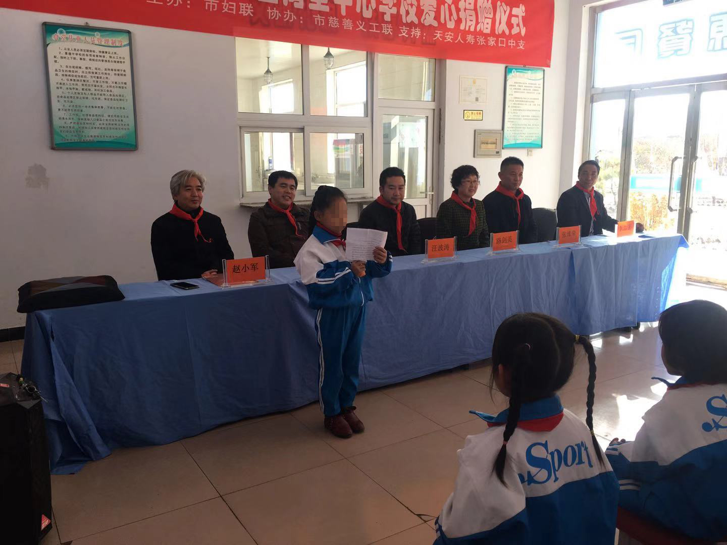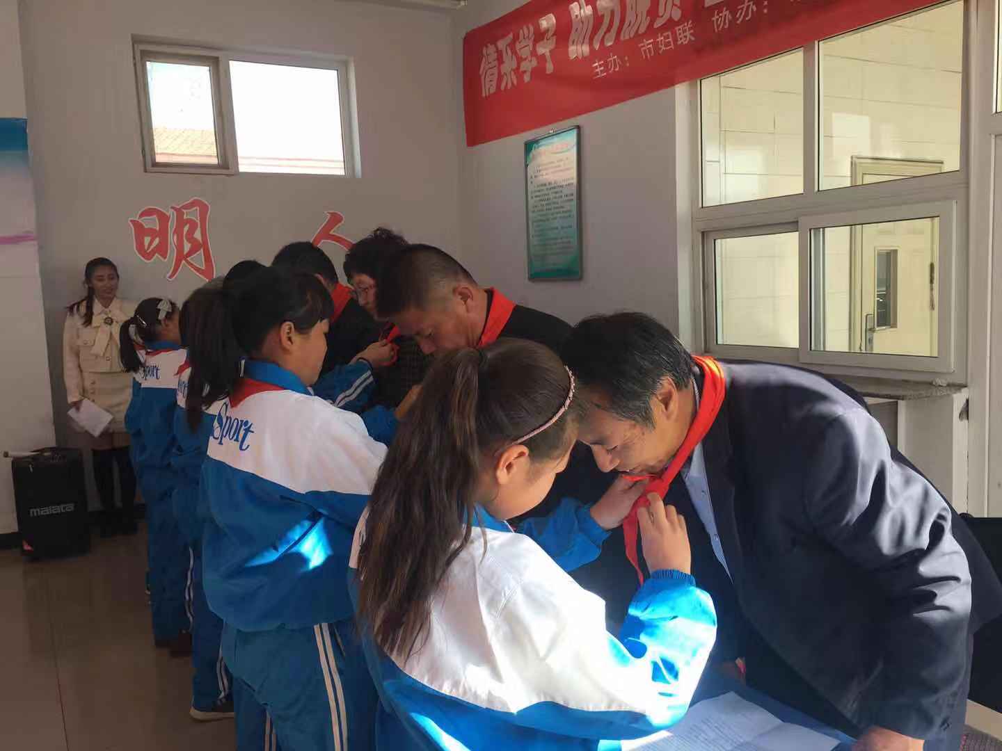 学生们为各位领导敬献了红领巾,市妇联副主席、党组成员路剑英和怀安县西湾堡乡党委书记张维荣分别对爱心企业的捐助表达了感谢,对学校教师与孩子们表达了关心和鼓励;