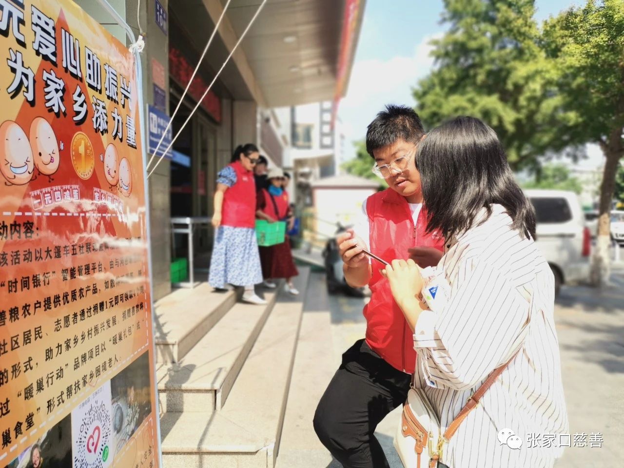 雷锋精神志愿者服务队组织队员开展了“一元爱心助振兴、我为家乡添力量”鼓励广大社区居民和商街流动市民,通过捐赠1元即可领取4颗鸡蛋的形式,助力家乡乡村振兴发展,将捐赠的善款,通过“暖巢行动”品牌项目以“暖巢礼包”或“暖巢食堂”的形式帮扶家乡困境老人志愿服务工作,此次活动由河北慈善联合基金会和张家口慈善义工联合会联合发起,张家口慈善义工联合会雷锋精神志愿者服务队、张家口中美电器有限公司承办。