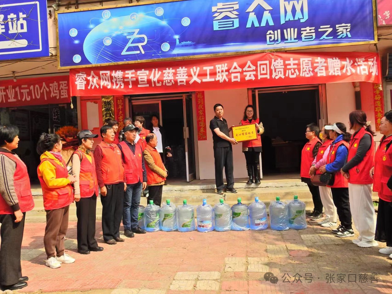 活动现场,睿众网商贸有限公司的工作人员热情洋溢,他们提前准备好了大量瓶装水,整齐地摆放在公司门口,以方便志愿者们领取。当志愿者们陆续到达现场,工作人员亲切地为他们送上瓶装水,感谢他们为社会所做出的贡献。同时,宣化慈善义工联合会也特意为睿众网商贸有限公司送上了写有“爱心商家”的牌匾,以表彰其在公益事业上的积极作为。