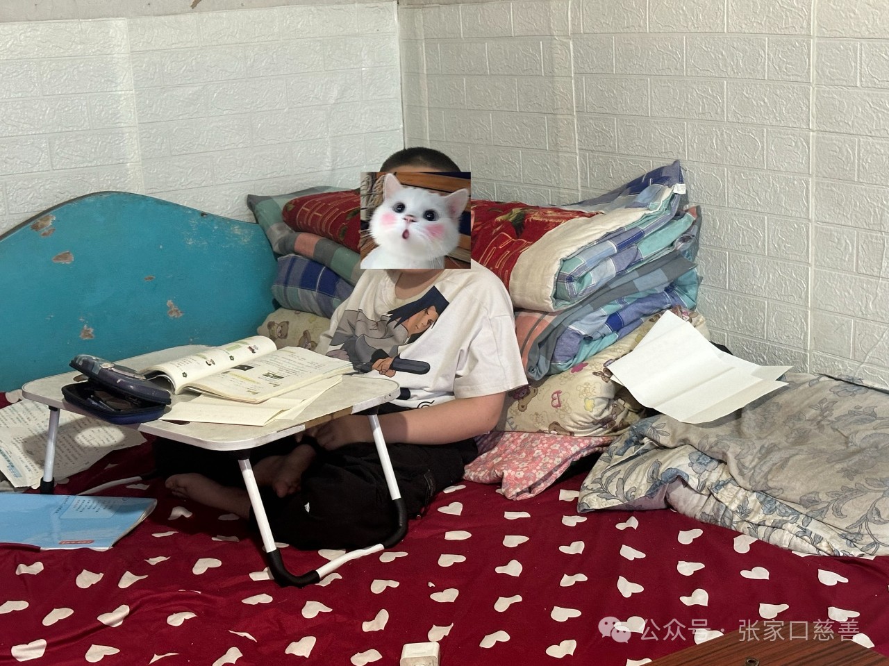 “家里的灯光有些暗呀,孩子本身身体不好,别再把眼睛看坏了!”走进贾同学家,孩子正在写作业,志愿者马东东关切的对孩子家长说道。贾同学患有严重的脊髓肌萎缩症,已影响到孩子的正常行走,每天上学由父亲背着到学校坚持听两节课。目前靠打针和康复治疗,从查出病到现在治疗费用花费大约二十万左右,现在每年打3针和做康复,每年大约需要7万元。父亲患有残疾干不了重活,父母只能靠种地维持生计,年收入一万左右,外债有8万左右。