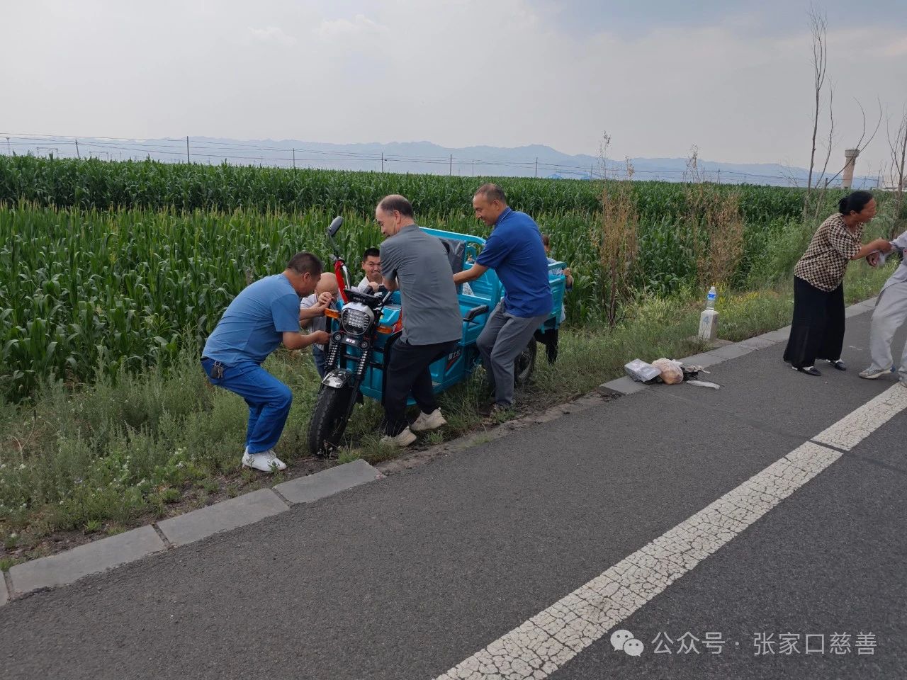 在本次考察途中,还发生了一个小插曲。一位老大爷骑着三轮车不小心连人带车一起翻下了路边的菜地里,由于年老体弱,只能无助地坐在原地。路上来来往往的车辆呼啸而过,唯有考察团停下了匆匆的步伐,停下车把大爷扶起来,并一起把车推出了菜地,还帮大爷联系到家人一切安排妥当后,才继续行程。正如张家口慈善义工联合会的愿景“让公益成为一种时尚”,希望在不久的将来,这些随手小公益可以遍地开花。