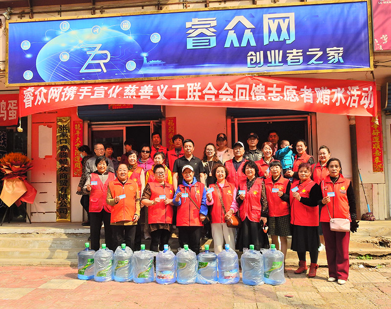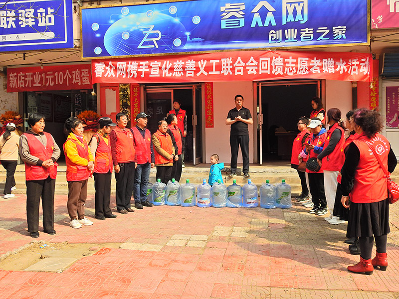 近年来,睿众网商贸有限公司董事长胡建勇在事业发展的同时,也热心于公益事业,身为宣化慈善义工联合会及志愿者,他能感受到作为志愿团队和志愿者的精神,为了回馈社会大家庭的温暖,他主动提出常年为联合会提供办公用水。胡建勇表示:今后将更大力度投入到爱心公益事业当中,继续为社会奉献自己的一份力量,为贫困弱势群体带去希望。