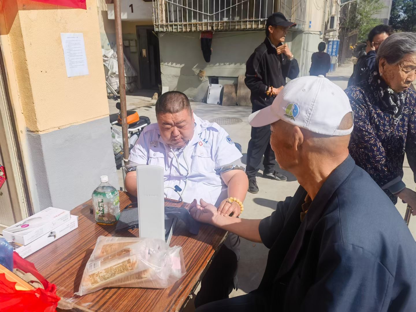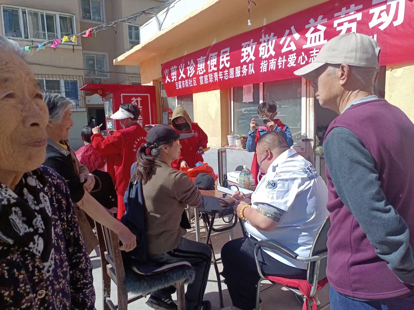 志愿者做好准备工作以后,前来理发的居民络绎不绝,一把剪刀、一把推子、一把梳子、一个围布,一把椅子、几件理发工具,构建起一个简易的“理发店”。理发师与老人们聊趣事、拉家常,亲切的询问老人们喜欢的发型,细心地为每一位老人修剪头发,看着理出的清爽利落的发型,一个个脸上露出了满意的笑容,纷纷竖起大拇指对活动连连称赞,解决了老年人群体的“头等”大事。工具虽简单,但志愿者的真情服务却让人暖在心里。义诊区更是排起长队,医生根据不同情况给予针对性指导,传播健康理念,提升居民安全风险意识。医生现场讲解健康养生知识和疾病预防常识,为老人们进行血压检测、健康咨询,悉心聆听老人们关于身体健康、日常用药的问题,耐心地为老人问诊并叮嘱老人们用药方法和注意事项。