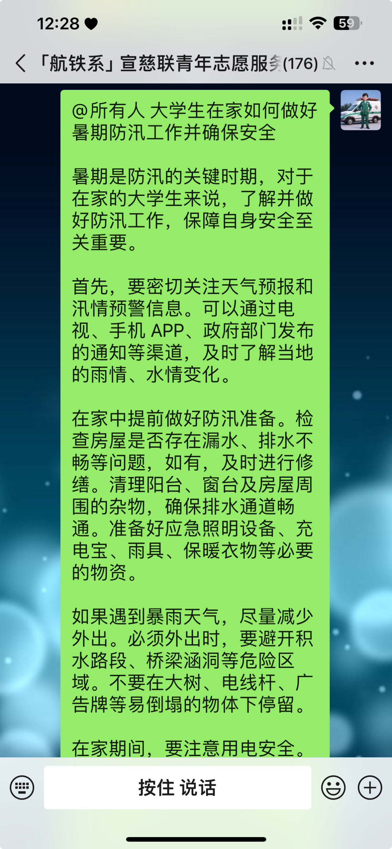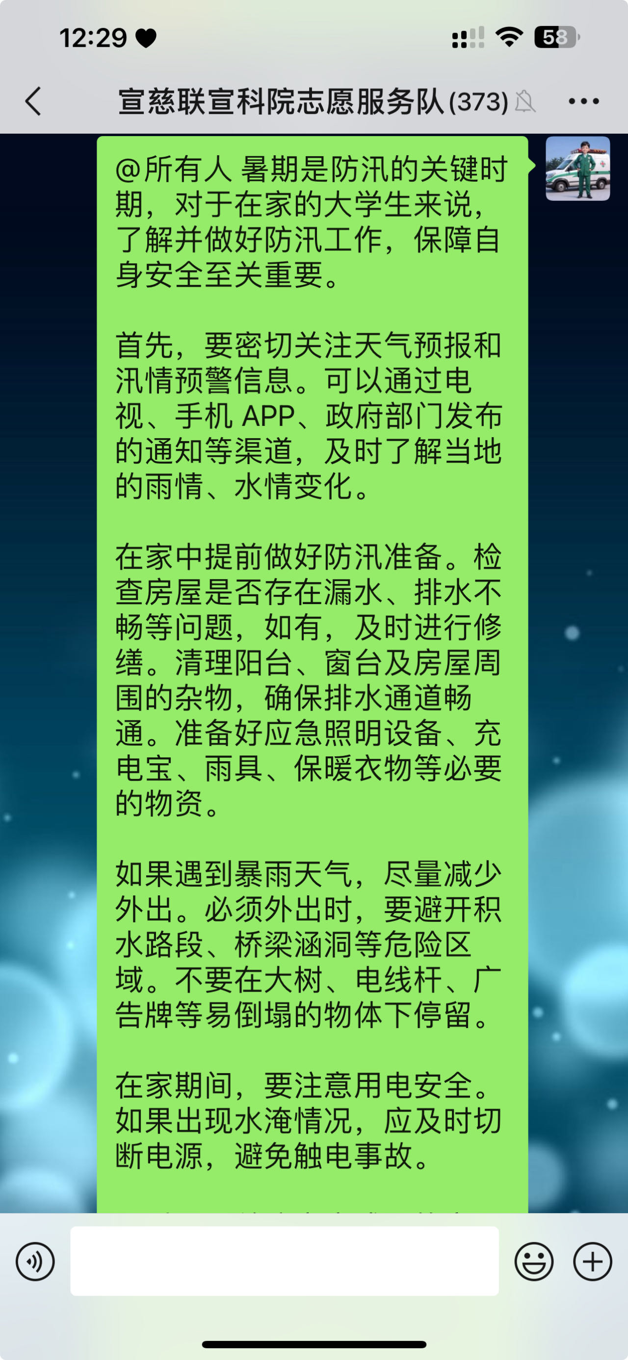 在会议中,韩智刚队长着重强调了暑期防汛工作的紧迫性和重要性。他指出,当前正值汛期,全体志愿者要高度警惕,随时准备投入到防汛工作中。要密切关注气象信息,加强对社区及周边区域的巡查,及时发现并排除潜在的安全隐患。同时,要做好防汛知识的宣传,提高居民的防汛意识和自救能力。