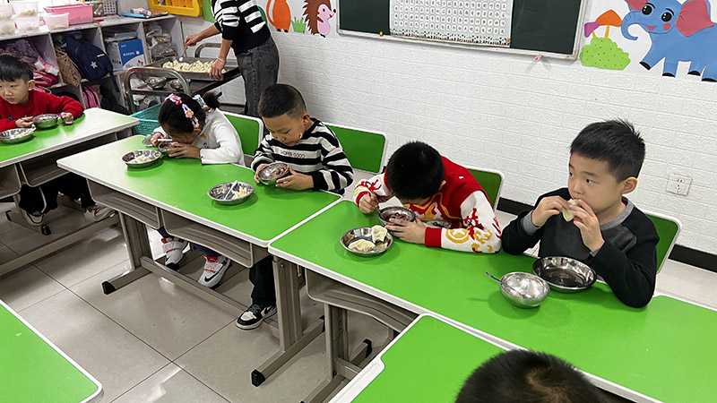 十一点准时开饭,孩子们在老师的带领下,有序地来到食堂。当他们看到那一盘盘热气腾腾的饺子时,脸上露出了惊喜的表情。志愿者们将饺子端到孩子们面前,看着他们吃得津津有味,心中充满了成就感。这些饺子不仅仅是食物,更是一份份浓浓的关爱。在这个过程中,志愿者们还不时地询问孩子们是否好吃,是否需要再来一些。他们用自己的细心和耐心,让孩子们感受到了无微不至的关怀。