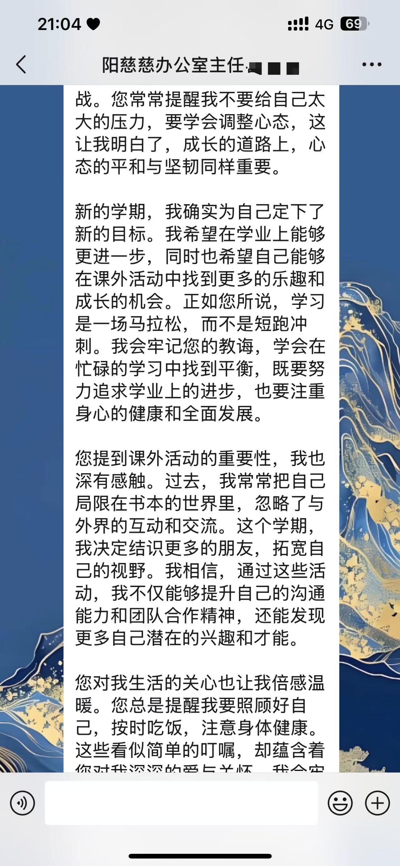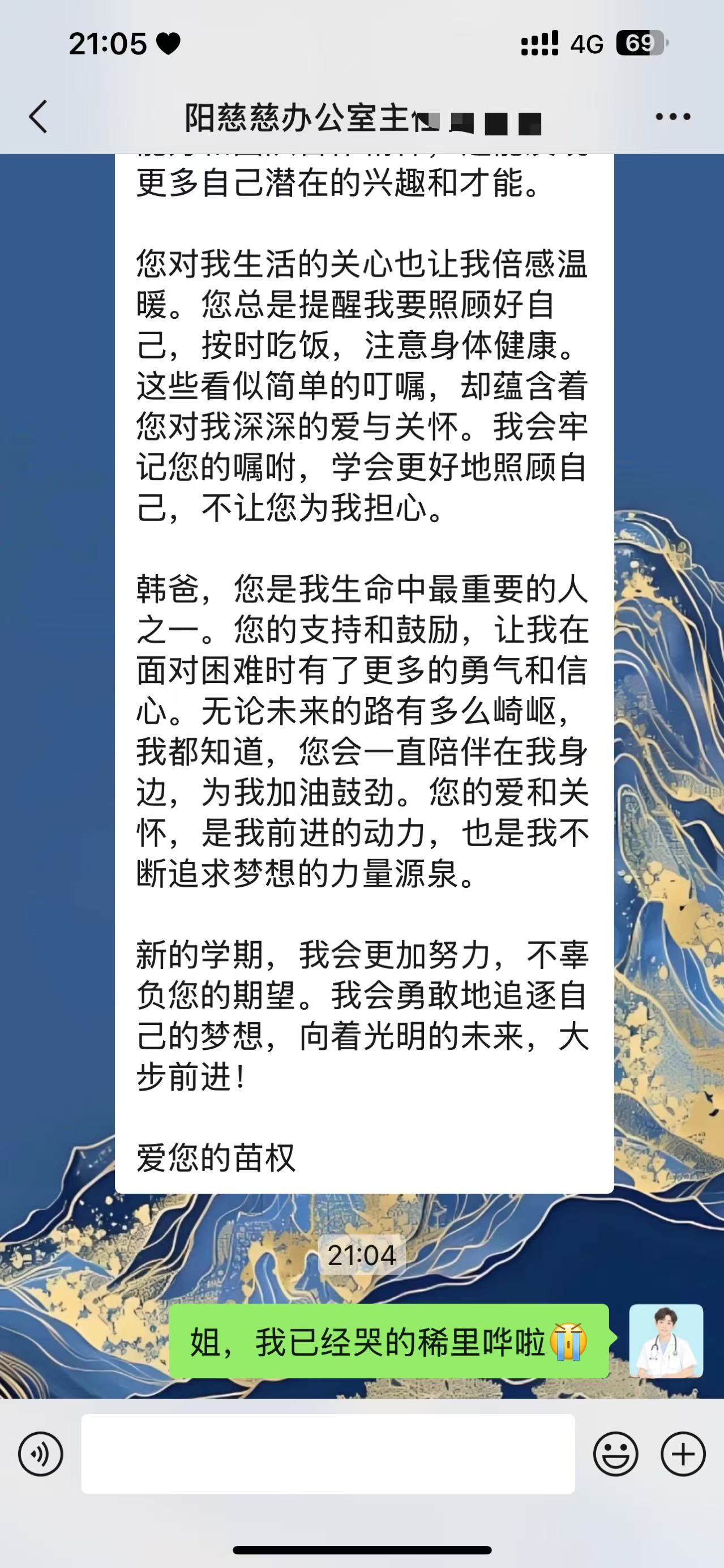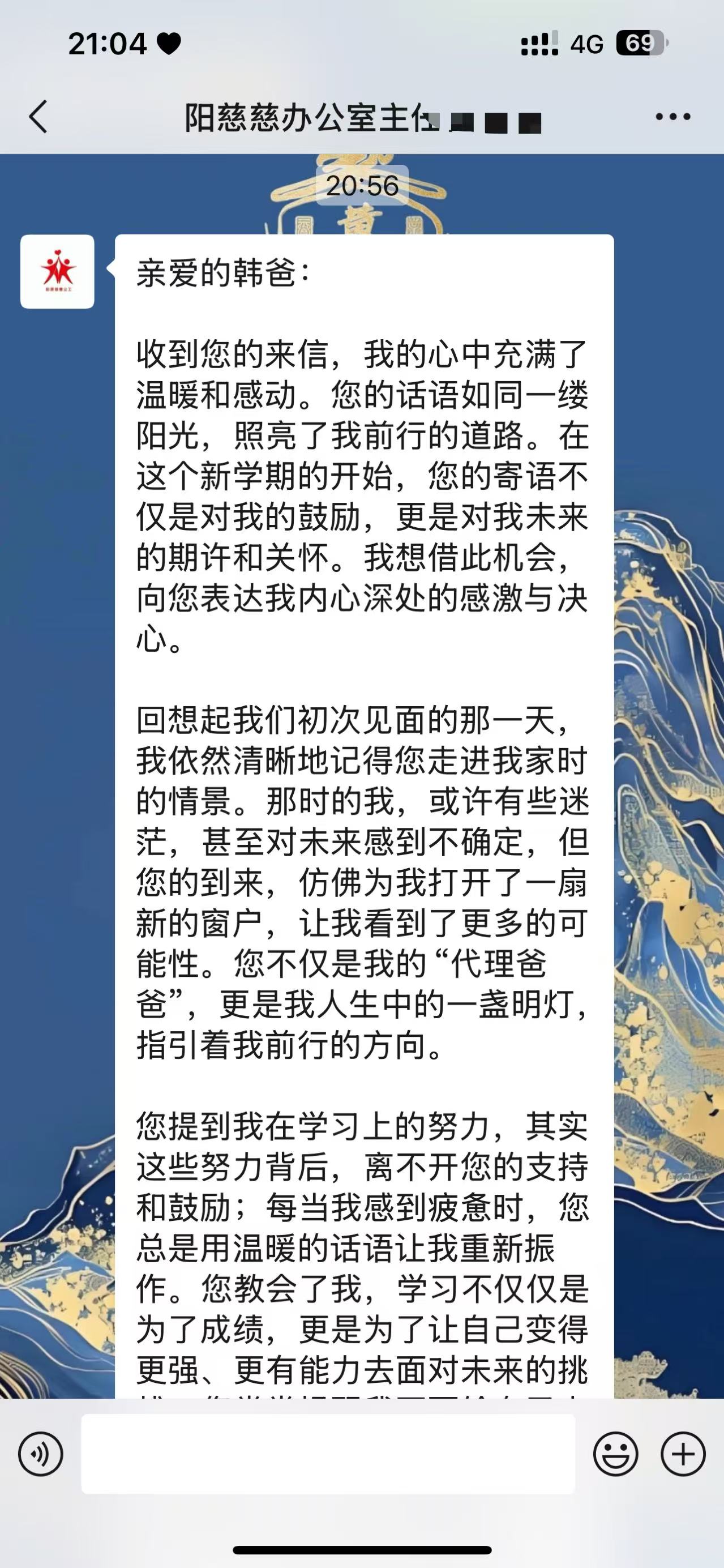 信件由阳慈联慈善义工联合会办公室主任翟秀霞通过微信转发给韩智刚。当韩智刚看到那熟悉的字迹,点开信件的瞬间,他的内心五味杂陈。那些与刘某权相处的点点滴滴,如同电影般在他脑海中不断放映。读着信,韩智刚的眼眶渐渐湿润,泪水不受控制地滑落。他深知,自己付出的每一份努力,都在这个孩子的心中种下了希望的种子,如今,这颗种子正在生根发芽。