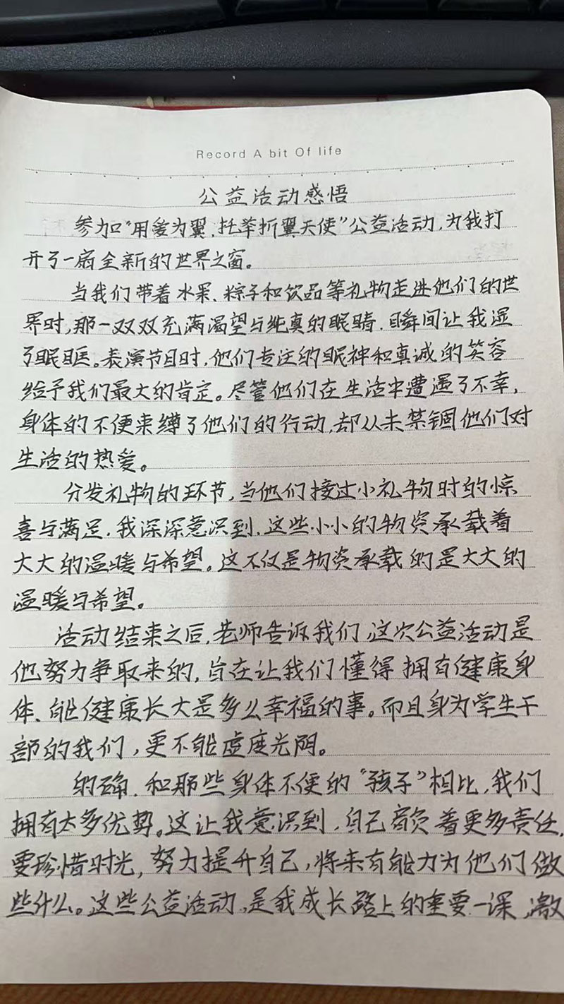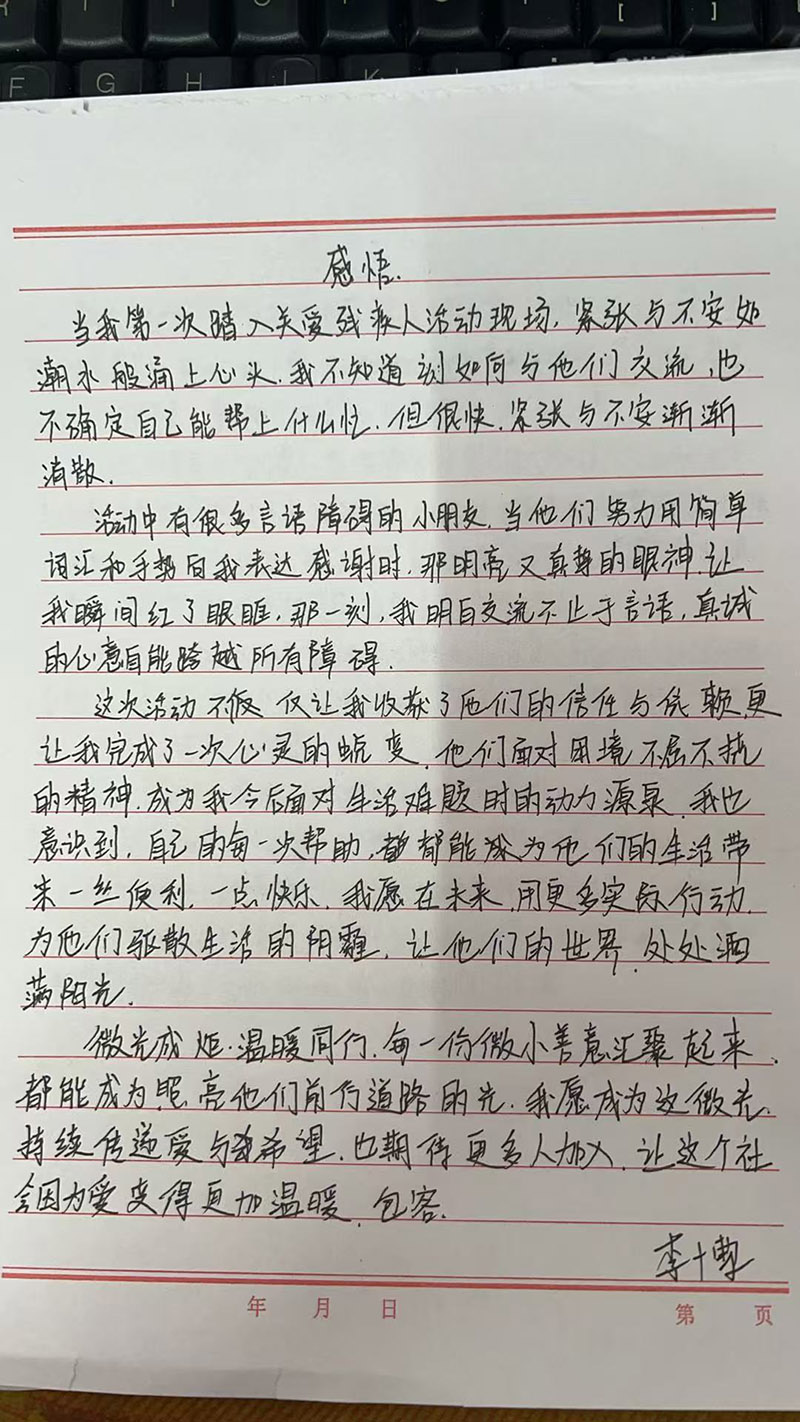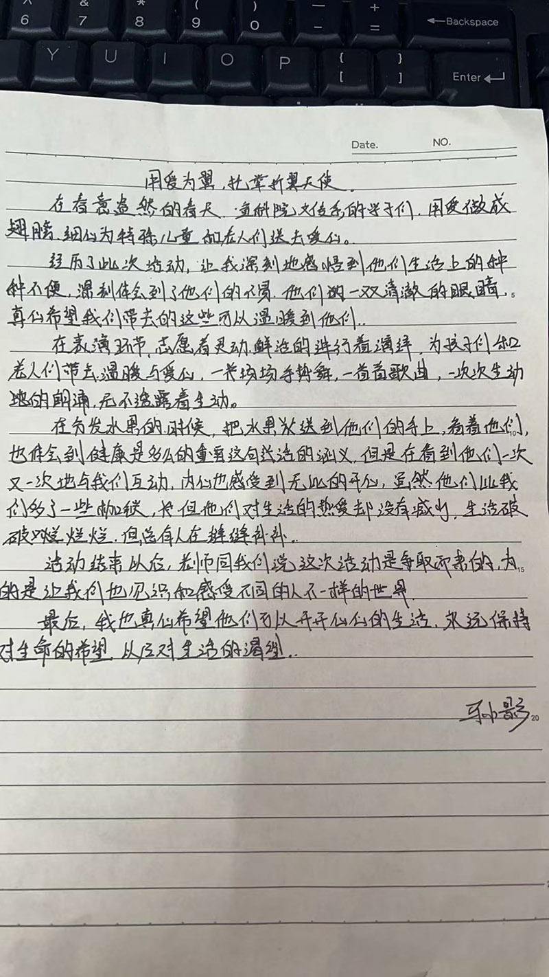 2025年4月17日讯 近日,由宣科院文传系志愿者团队精心组织、全力投入的“用爱为翼,托举折翼天使”公益活动温暖落幕。此次活动聚焦特殊儿童群体,在孔雪老师的悉心指导与带领下,志愿者们用实际行动传递爱心,为特殊儿童的成长助力,谱写了一曲温暖人心的公益之歌。活动结束后,志愿者们纷纷写下心得体会,回顾这段难忘的经历,字里行间满是触动与成长。