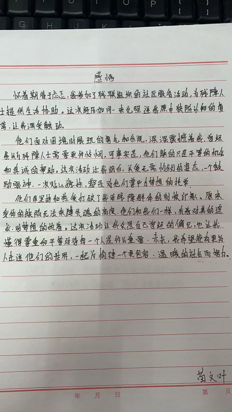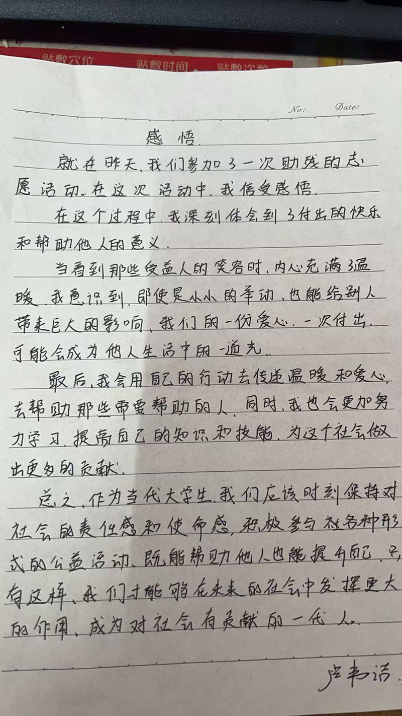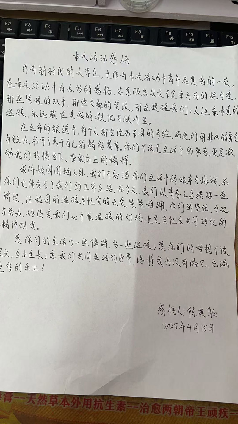 2025年4月17日讯 近日,由宣科院文传系志愿者团队精心组织、全力投入的“用爱为翼,托举折翼天使”公益活动温暖落幕。此次活动聚焦特殊儿童群体,在孔雪老师的悉心指导与带领下,志愿者们用实际行动传递爱心,为特殊儿童的成长助力,谱写了一曲温暖人心的公益之歌。活动结束后,志愿者们纷纷写下心得体会,回顾这段难忘的经历,字里行间满是触动与成长。