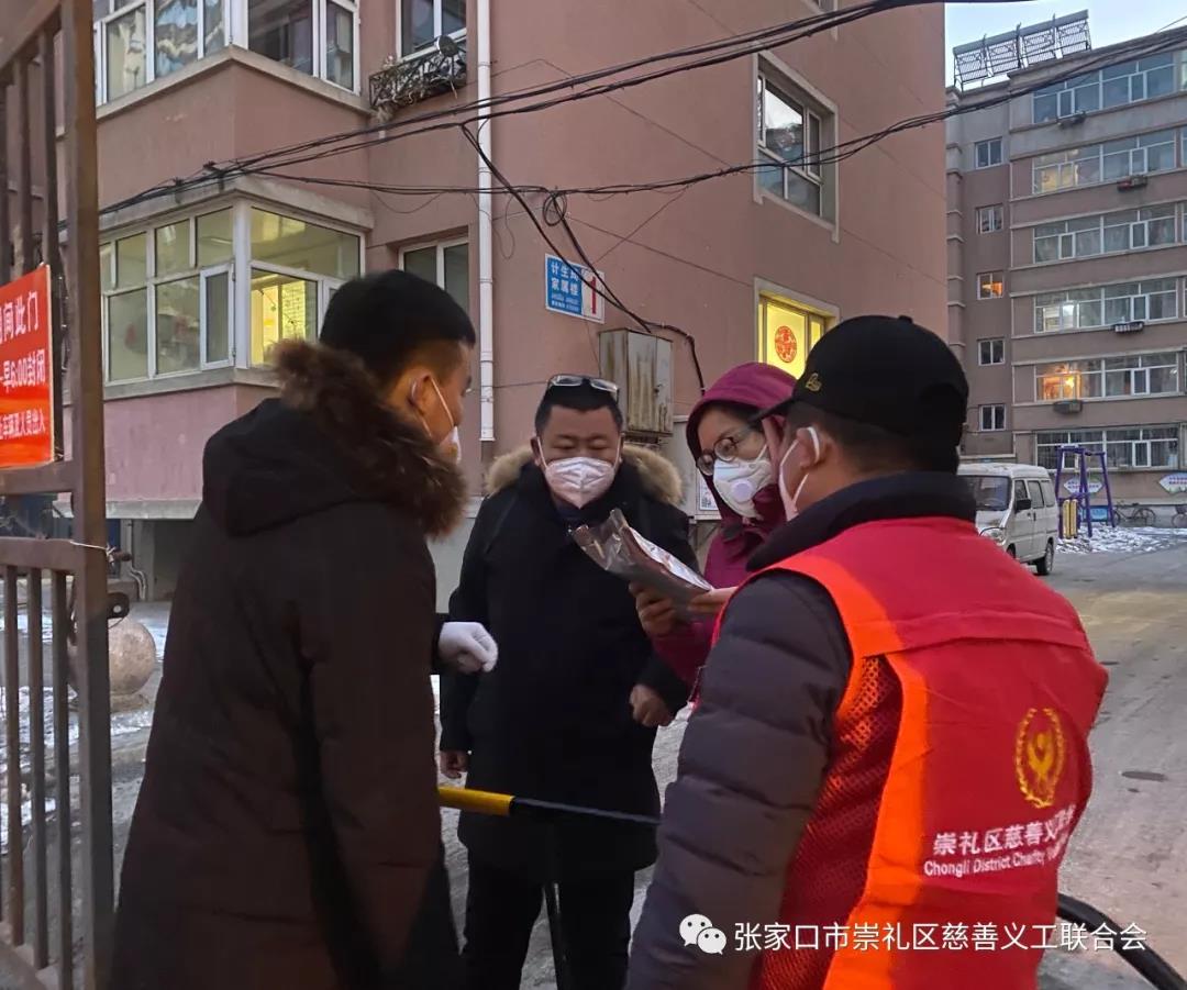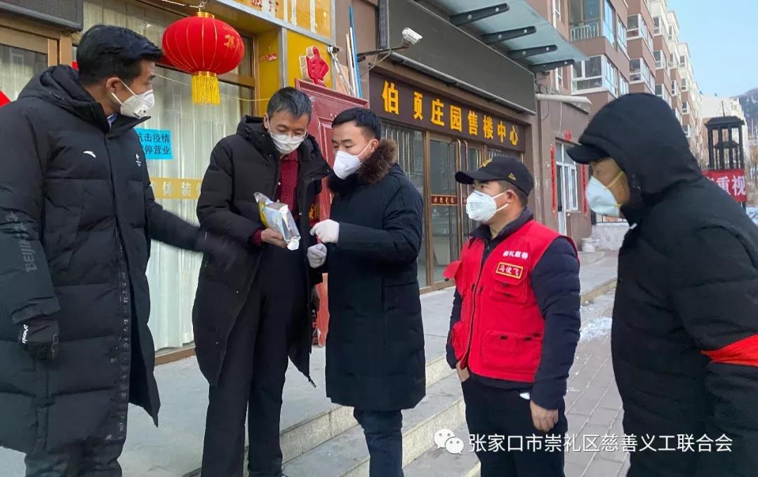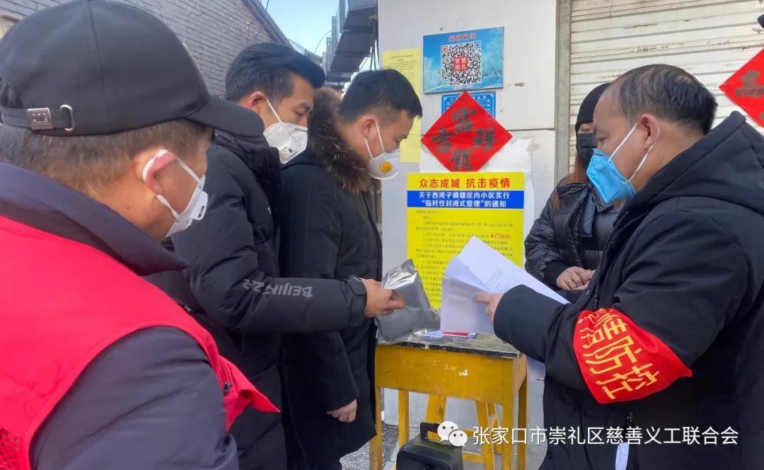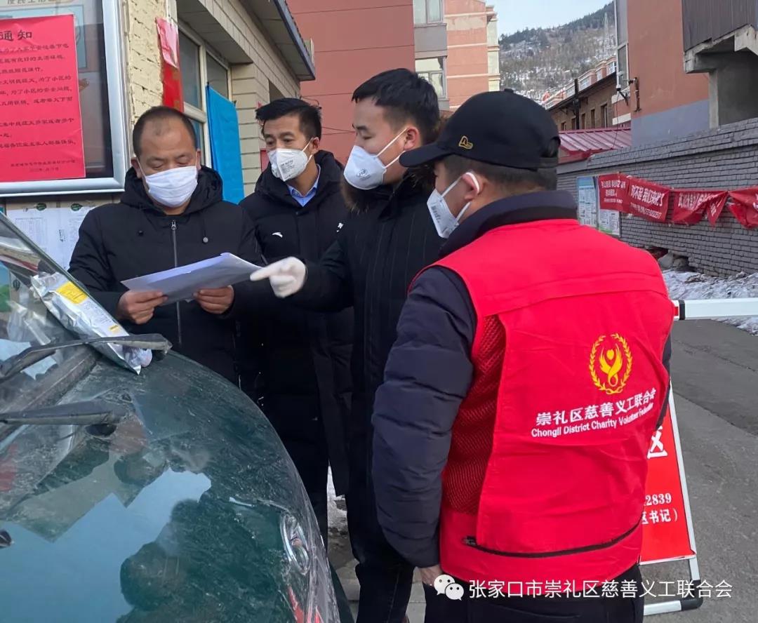 张家口市崇礼区慈善义工联合会会长张华、副会长马俊飞、中共崇礼区委组织部党建三科科长闫建峰为崇礼区22个小区及北京环卫集团发放消毒泡腾片及连花清瘟胶囊。