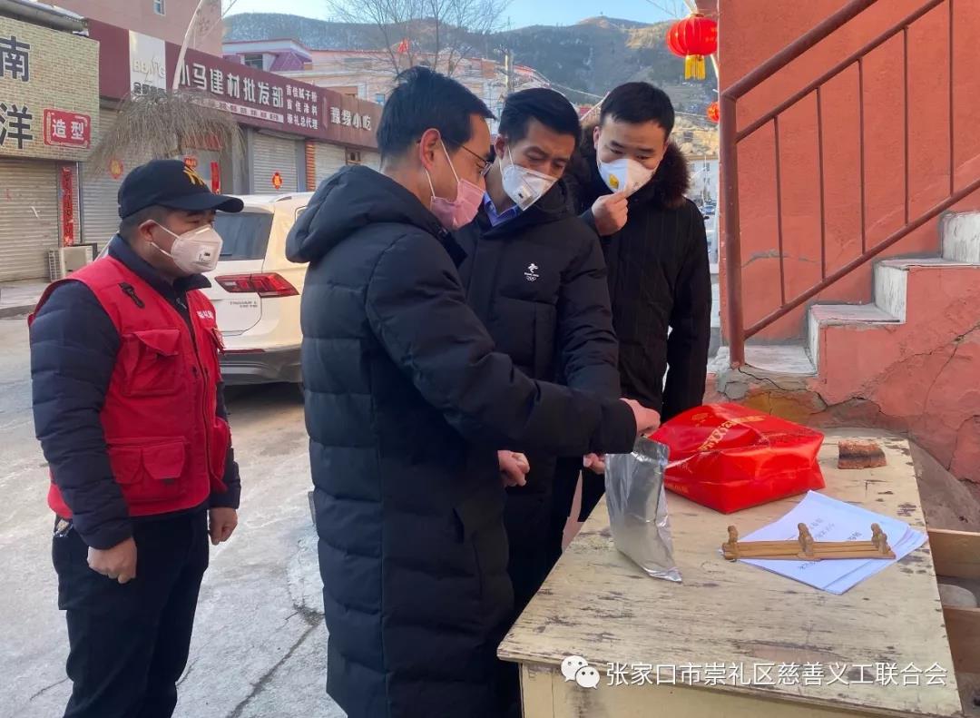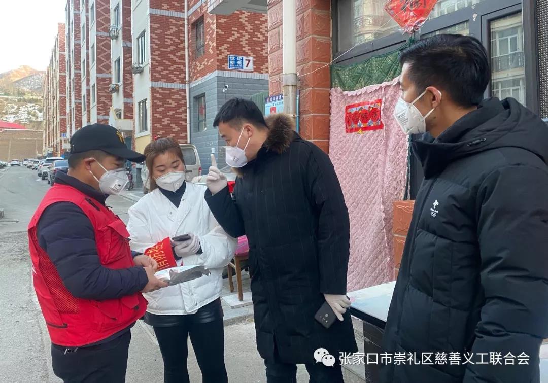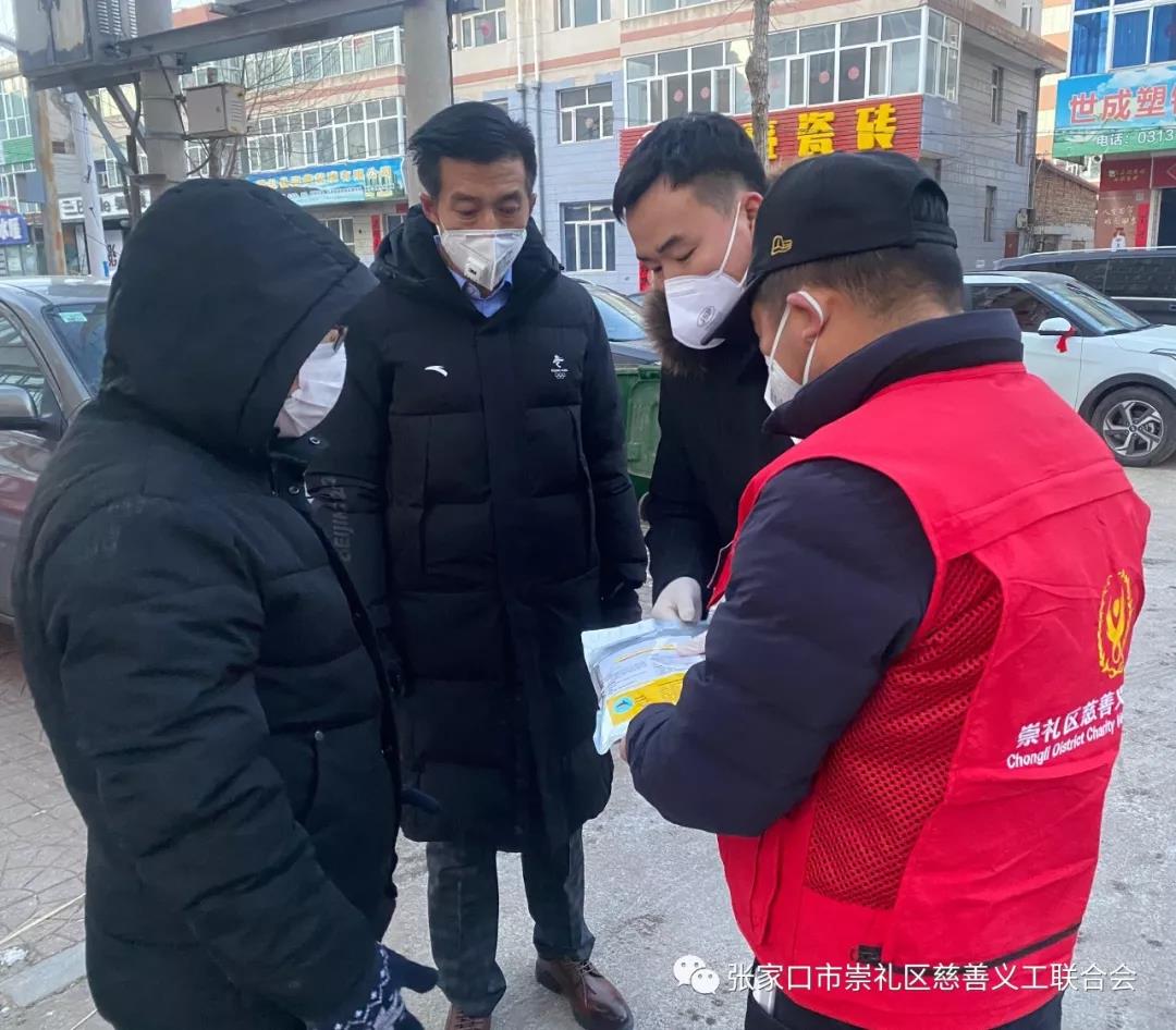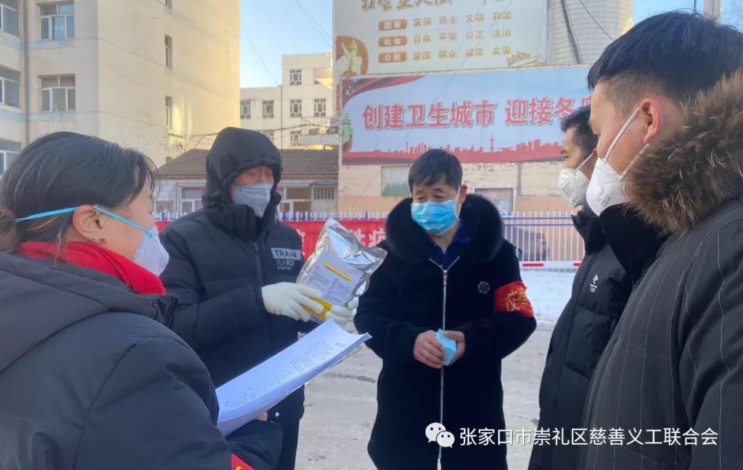 张家口市崇礼区慈善义工联合会会长张华、副会长马俊飞、中共崇礼区委组织部党建三科科长闫建峰为崇礼区22个小区及北京环卫集团发放消毒泡腾片及连花清瘟胶囊。