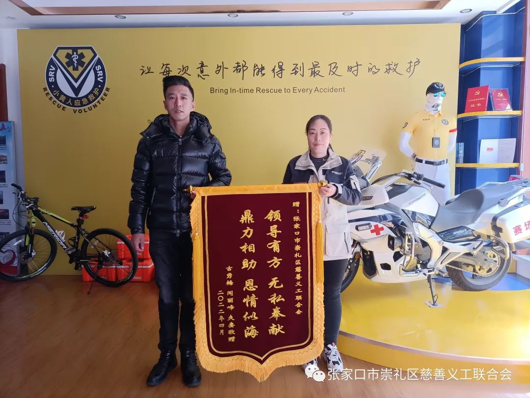 2021年工作人员边飞艳收集到一位严重车祸患者闻丽峰的资料,患者因遭遇严重车祸导致骨盆骨折、颈椎骨折、胸椎骨折、多处肋骨骨折、轻微脑出血,一共花费将近40万,家里还有个上初中的孩子,所有的生活重担落在了妻子一个人身上。了解到情况联合会经过重重困难为患者筹集到将近上万元的救助款,为家里提供了一定的帮助,为了表示感谢,2022年3月31日上午10点患者家属亲自来到张家口市崇礼区慈善义工联合会送来锦旗以表谢意。