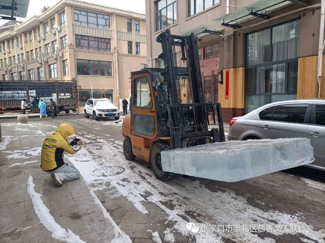 张华会长特意从官厅水库运回来满满一货车冰块,为了搬运方便张华会长还雇来一辆叉车,为了让志愿者们一同参与到冰雕活动当中亲身人非体验,邀请来专业冰雕师在现场为志愿者们指导普及雕刻技法。冰雕师耐心的为志愿者们进行讲解,有的志愿者们表示自己的老家很少下雪,也没有冰雕,非常高兴能有机会参与冰雕,感受崇礼冰雪的魅力。
