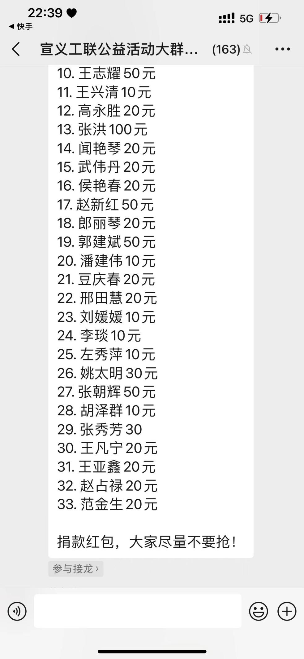 最美的遇见就是一起携手共进在公益的路上!苍天无情,人间有爱。6月20日,宣慈联的一位志愿者因母亲急需医治眼睛的手术费还缺一些,急得不知如何是好。秘书长苏存芳知道这个事情后,经过与义工家人们协商在群里发起募捐。红包如纷飞的纸片,不出几个小时,就筹够了所需的数目。在大家纷纷奉献上爱心的同时也期盼志愿者母亲的眼睛早日康复。