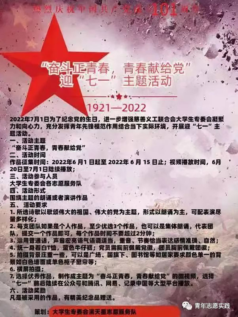 大学生专委会各志愿服务队将团队选送的作品(非原创作品请标明出处及作者)发送至marilyn620-2008@163.com, 作品提交截止时间2022年6月15日。