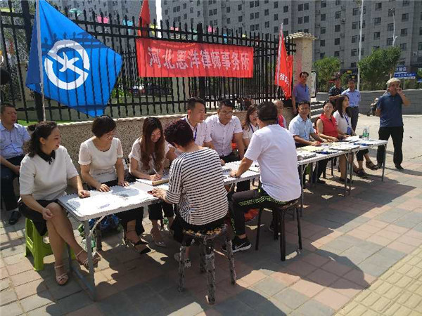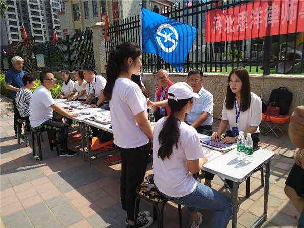 上午八点半,河北思洋律师事务所的十多位律师及义工联工作人员在世纪路社区凤凰城二期西侧鑫南北大市场对面的活动现场就位,现场摆放好了桌椅,报纸及一些法律宣传资料,陆续有附近居民上前咨询。法律志愿者微笑接待,用他们专业的知识和敬业的态度为社区居民耐心解答。本次活动中,河北思洋律师团队主要承担为辖区居民、企业免费提供法律咨询活动,解答企业在经营过程中遇到的疑难法律问题,解答居民在日常生活、经营中遇见的各种劳动、侵权、婚姻、家庭等纠纷。夏日炎炎,法律志愿者不畏骄阳,一直忙碌着,前来咨询法律疑问的居民络绎不绝,活动持续到近中午才结束。
