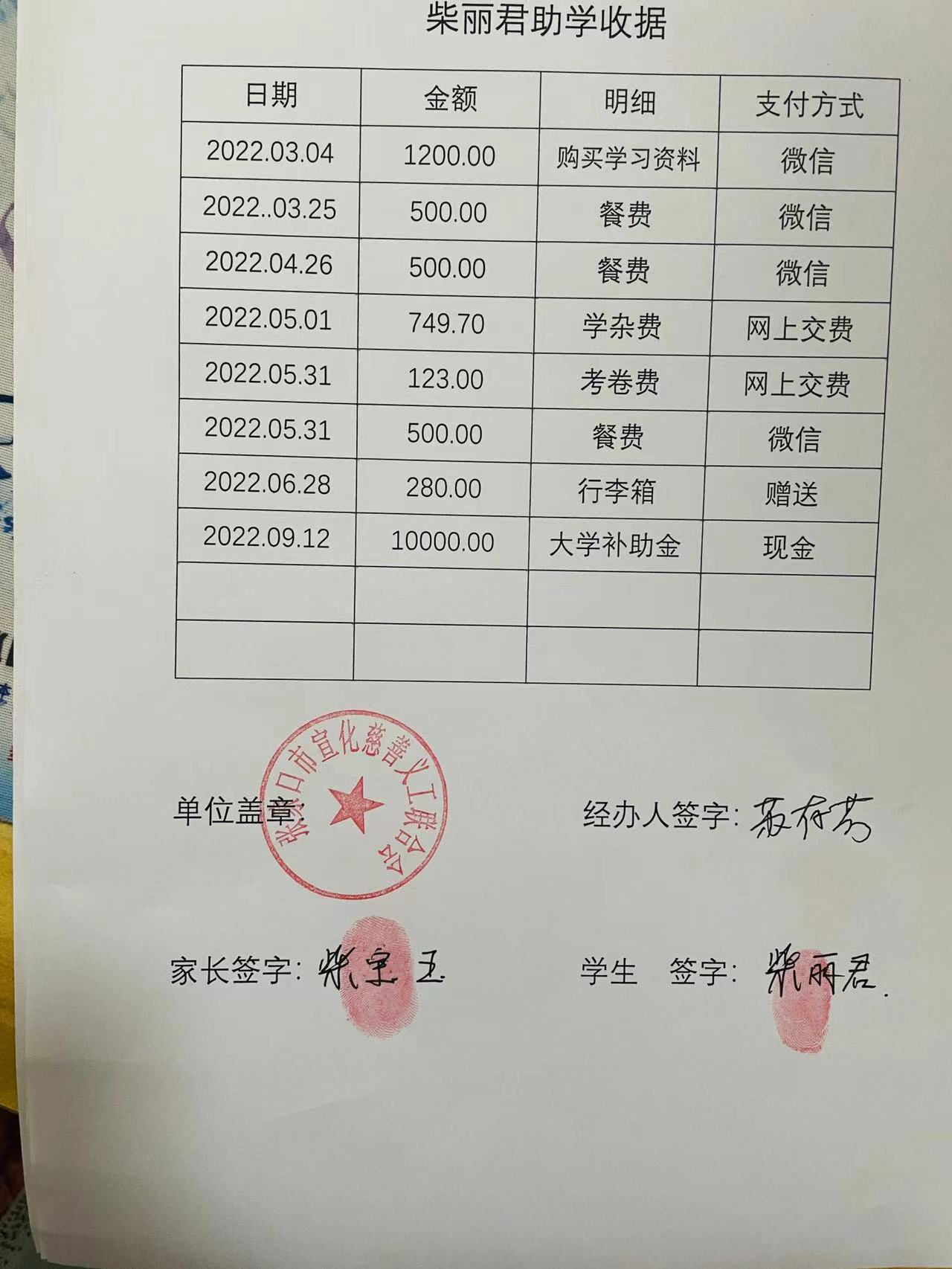 为柴丽君发放助学金