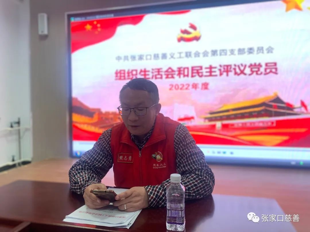 会上,樊志勇同志带领大家学习了党的二十大报告内容、《党章》、习近平同志在十四届全国人大一次会议上发表的重要讲话及2023年全国两会精神要点,宣读了《中共张家口慈善义工联合会委员会关于认真召开2022年度基层党组织生活会和开展民主评议党员的方案》,樊志勇同志并且向支部党员做了2022年支部工作情况报告。