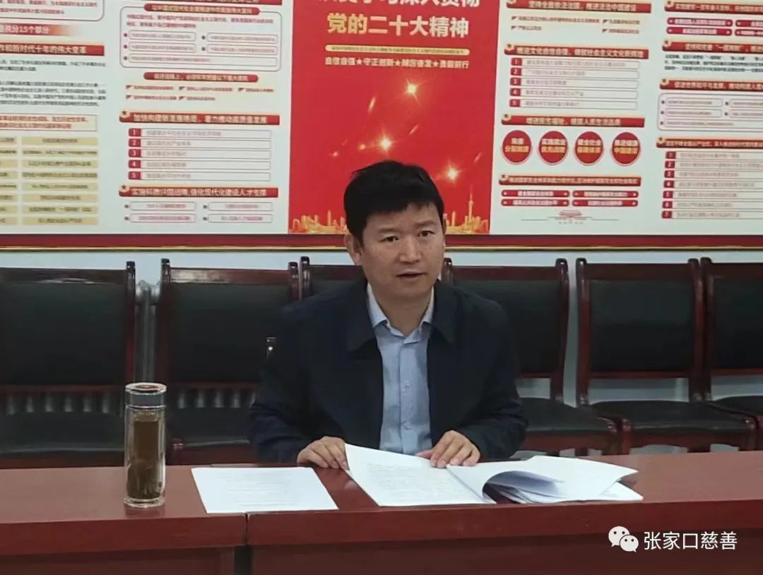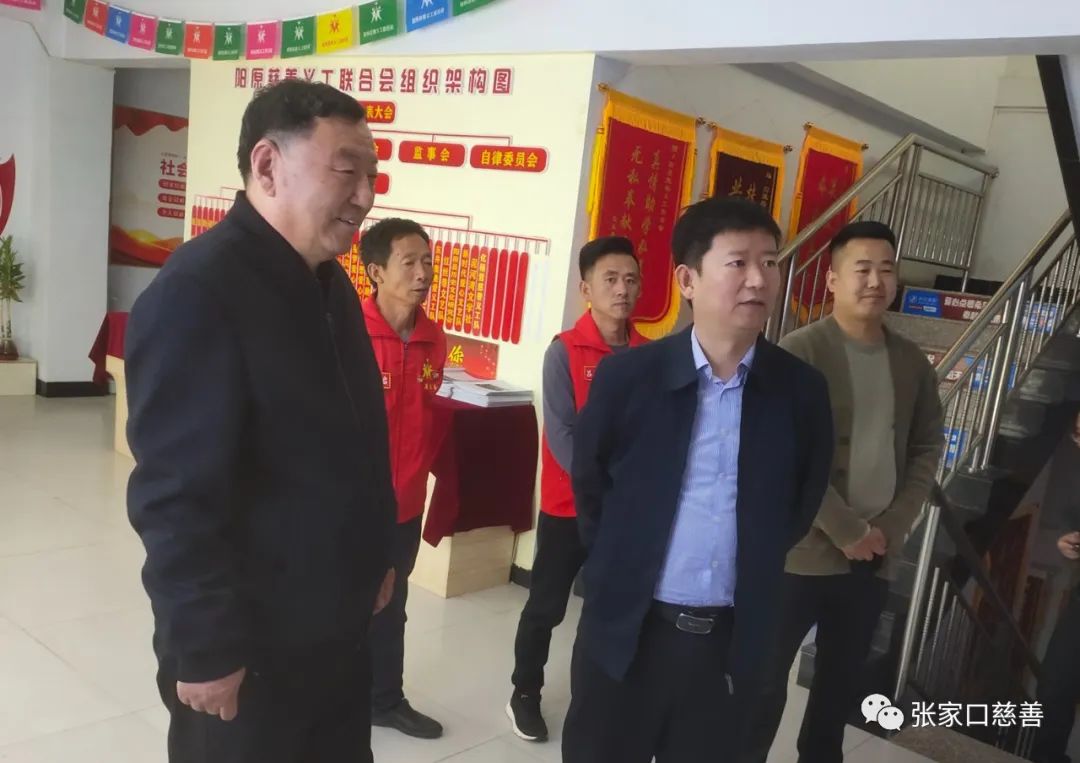 刘会长说:“阳原慈善义工联合会是一个服务于政府和公益组织的双向枢纽型爱心平台,是中国乡村发展基金会合作伙伴,河北慈善联合基金会工作站,张家口慈善义工联合会县区枢纽平台。现有26支团队,3000多名志愿者。六年来,紧紧围绕县委中心工作,牢记“为党增光添彩,当好政府助手,奉献一片爱心,共创美好社会”的光荣使命,把公益事业作为责任,全力推进志愿服务大众化、社会化建设。在创城、敬老、助学、抗疫、救灾、冬奥、应急、乡村振兴等活动中积极作为,书写了新时代壮美的雷锋故事,每年慰问群众2000多名,送出各类善款80多万元;组织各类慈善公益活动600多场次。为创建和谐美丽新阳原做出了积极贡献。先后被授予“河北省先进志愿服务组织”、“河北省学雷锋志愿服务先进集体”、“张家口市最美志愿服务平台”、“最美阳原人(团队)”等荣誉称号。”他说,阳慈联今天的成绩,是各级领导亲切关怀和高度信任的结果,是全体志愿者共同努力的结果。4月25日,县委书记郝燕飞到我们联合会指导工作,5月6日,市委两新工委组织50多名非公经济和社会组织党组织书记、党建指导员来阳慈联拉链观摩,我们历历在目,深受鼓舞。9月7日,又启动了“99”公益日“活水计划”项目,现已筹资46.82万元,该项目将使阳原150名残障人士受益;“助力阳光少年圆梦”正在进行,130名学生将得到1200-2000元不同程度的资助;目前正在重点进行主题教育、申报“五星级”党组织等工作,策划“119”消防宣传、“12.4”法制宣传、“最美志愿者”评选等活动。曹书记对阳慈联的工作表示充分肯定,他说,我在来阳原慈善义工联合会之前,就对你们的工作有所了解,党建引领、慈善公益等各项工作都很有成效,今天又有了新的认识,确实了不起。今后要多谋划大项目,加大宣传力度,力争把阳原的慈善公益事业搞得更好。