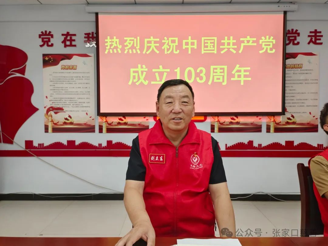 刘立东会长主持活动,他说,今天是中国共产党的生日,我们的党已经走过了103年的光辉历程,忆往昔峥嵘岁月,看今朝辉煌灿烂,坚定跟党走是永恒的主旋律,愿我们的党披荆斩棘,带领全国人民从胜利走向更大的胜利。