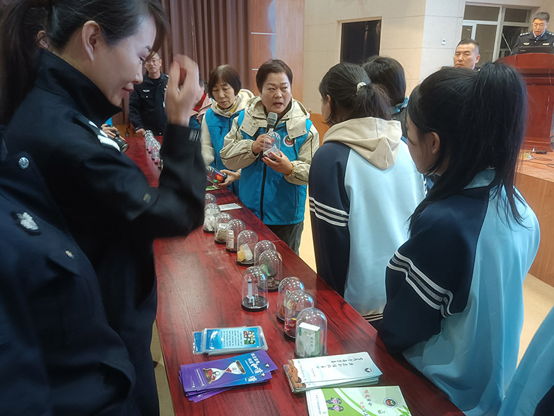 在活动现场,戒毒民警和志愿者通过宣传展板,悬挂、张贴禁毒宣传标语,为中学生发放禁毒资料、讲解毒品知识等方式,宣传毒品的危害,号召大家积极举报涉毒违法犯罪行为,积极参与禁毒斗争,珍爱生命,远离毒品。引导中学生自觉抵制诱惑,努力形成全社会共同参与禁毒斗争的浓厚氛围。强制隔离戒毒所赵勇强副所长、董荣光、杨国新、史明霞,李嘉轩、吴静、冯艳婕、张红启等戒毒所干警和福德仁爱公益队毛艳芳队长、李建利、胡玉琴、孙秀萍、李淑琴,马玉萍参加了这次活动。