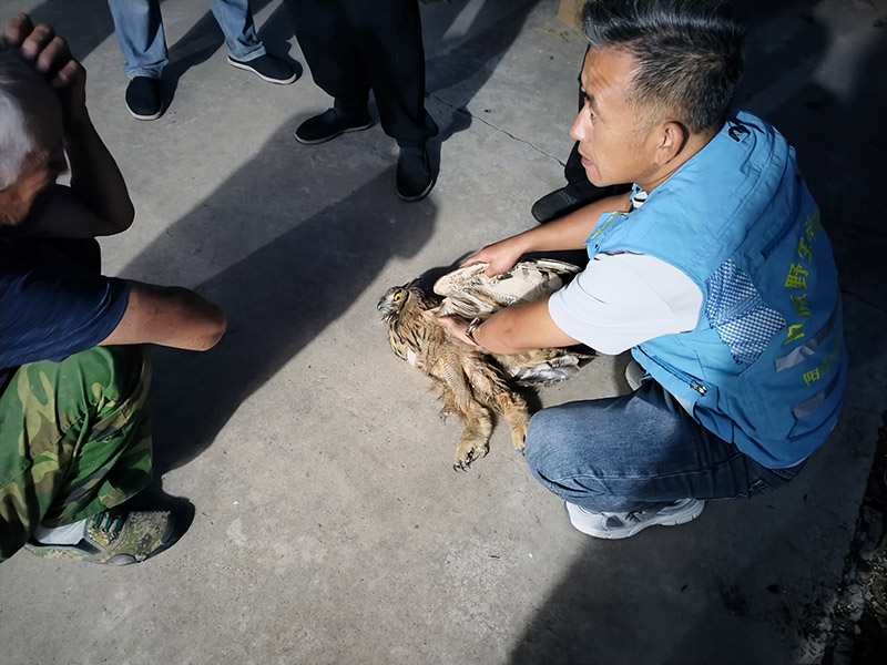 眼下正是鸟类迁徙季节,也是鸟类受伤害多发季节。在野生动物救护过程中,鸟类救护约占整个野生动物救护数量的60%以上。鸟类是人们生存环境的检验员,善待鸟类,也就是善待我们自己。 2025年9月12日下午,阳原野生动物救助中心接到一通来自自规局领导的电话,电话中提及,东城镇千家营村驻村书记接到当地一位村民的报告:“我发现了一只受伤的大猫头鹰,它既不会飞也不会走,看起来伤得挺严重,你们快来看看能不能救救它。”救助中心负责人吕志强得知消息后,深知情况紧急,立即决定亲自前往救助。他迅速驱车出发,历经25公里的路程,赶赴东城镇千家营村现场。