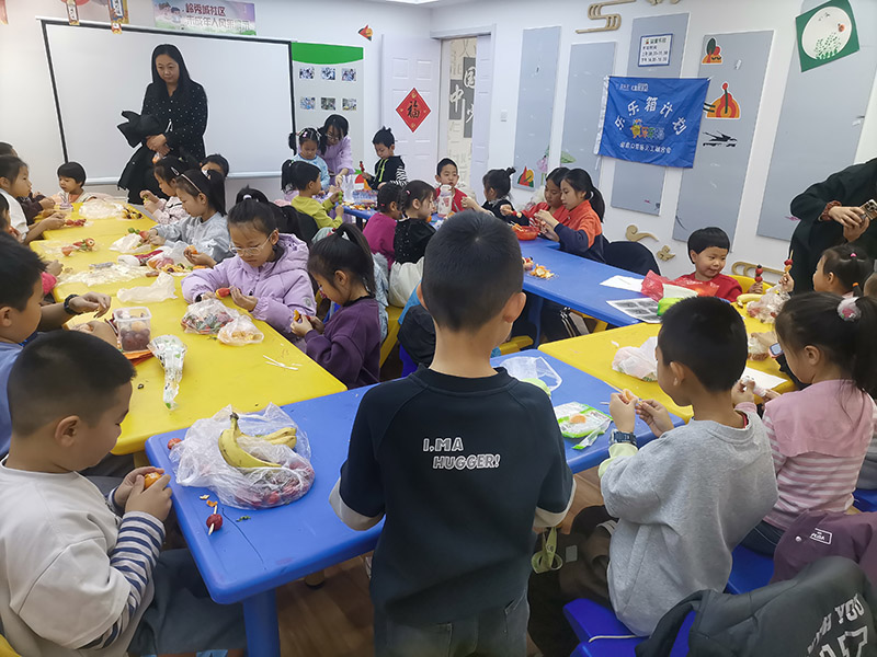 活动伊始,孩子们怀揣着期待,纷纷自备了自己喜爱的水果。红彤彤的草莓、金黄的橘子、晶莹的葡萄、酸甜的山楂、脆甜的苹果……这些色彩缤纷的水果汇聚在一起,仿佛预示着一场甜蜜盛宴的开启。在老师们的引导下,孩子们小心翼翼地将水果洗净、去核、切块,然后用竹签将它们串成一串串可爱的小串。这个过程中,孩子们的脸上洋溢着专注而兴奋的神情,他们互相交流着自己的创意,不时发出欢快的笑声。