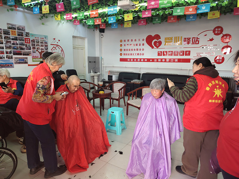 雷锋理发队队长吴桂荣,带领队员沈满花、焦素珍、刘忠和王秀兰,春风送暖爱心队的队长帅振兰携队员张秀荣,两支队伍的志愿者们刚抵达驿站,便看到了许多等候理发的群众。老人们面带期待,邻里间轻声寒暄,热闹又温馨的氛围瞬间弥漫开来。