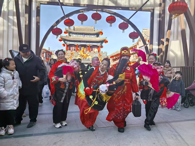 大年初一,万里长城重要关隘张家口大境门广场张灯结彩、年味浓郁。爱宝队金路艺术团的舞蹈志愿者们身着喜庆秧歌服,手持各种道具,以欢快热烈的秧歌舞为市民与游客送上新春祝福,用志愿活力点亮武城新春。