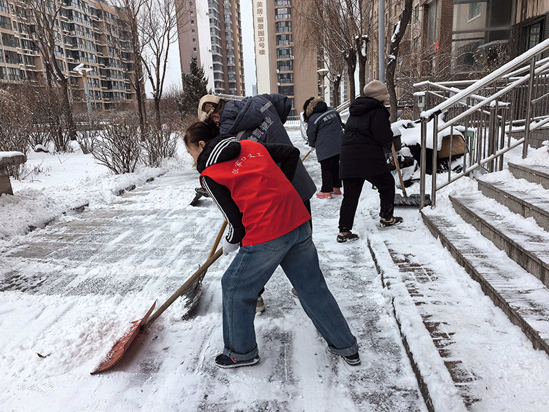 活动现场,志愿者们手持雪锹、扫把等工具,与物业工作人员分工协作、干劲十足。大家不畏春寒、默契配合,重点完成了社区一期9号楼、美居一期广场、二期28号楼周边道路及单元门前的扫雪除冰工作,及时清理积雪暗冰,为居民开辟出一条条安全通畅的出行路。