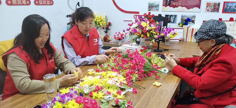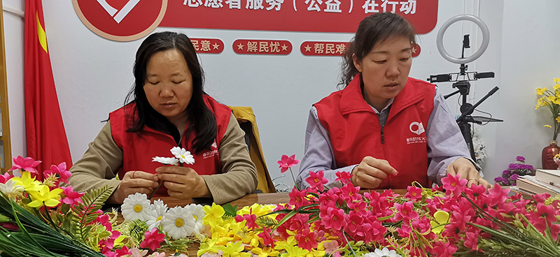 活动现场,妇女们与志愿者围坐桌前,桌上铺开各色花瓣、细小的花蕊花蒂,还有翠绿的花叶和花枝。志愿者拿起一片花瓣,教大家如何与花叶错落搭配在花枝上,妇女们跟着操作,有的特意选了深绿花叶配浅粉花瓣,有的把花叶修剪成不同长度增加美感。