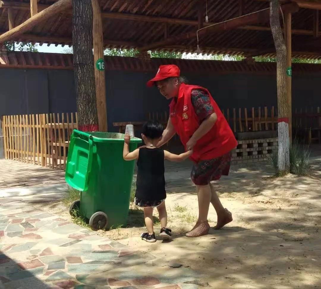 向园内的游客宣传环保的重要性,鼓励游园的小朋友把垃圾,包装袋扔到垃圾箱,用大手拉小手的方式,手把手的教宝宝把垃圾扔进垃圾箱。