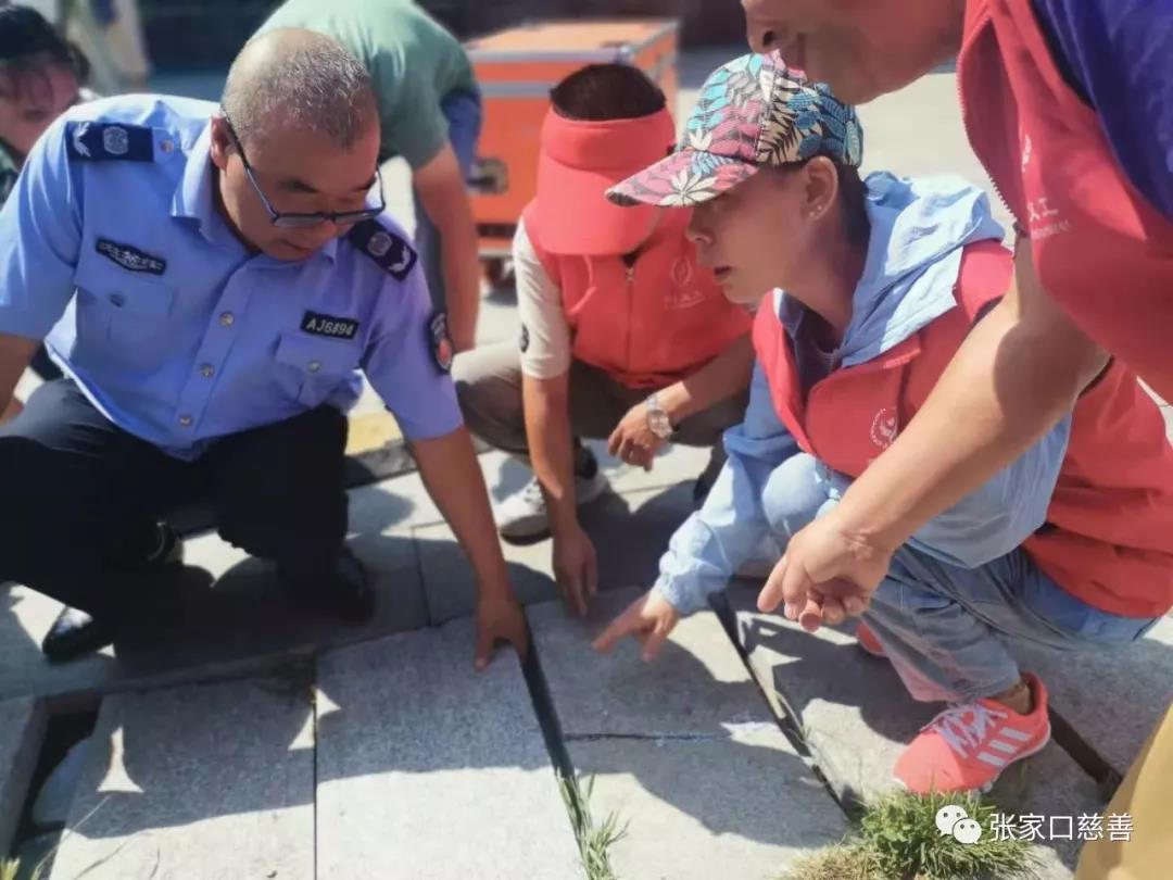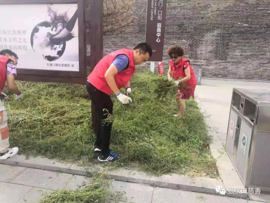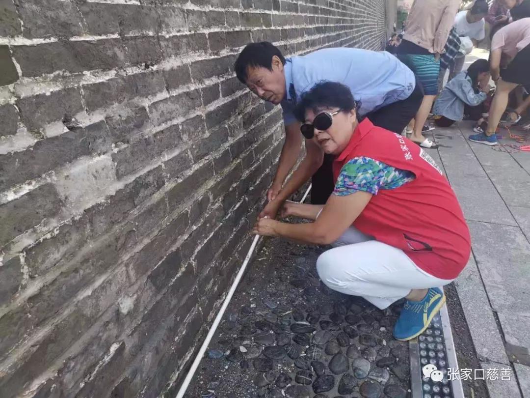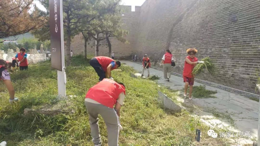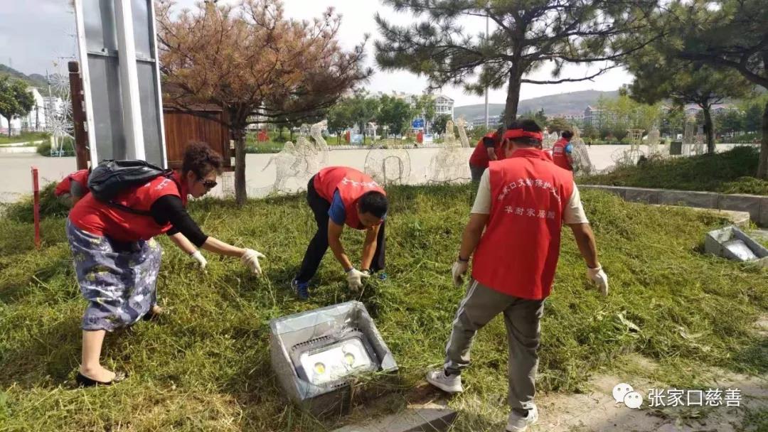 张家口慈善义工联合会文物保护队、长城护卫队、雷锋队的义工们,一行十多人,在游客服务中心交接完工作任务后,径直来到花圃区域。第一项任务是清理花坛里的杂草。大家虽然来自不同的队伍,有些义工朋友也是第一次见面,可大家不分彼此前后、不需太多语言,默契协作。清理杂草的、捡拾堆墩的,干的热火朝天。在清理杂草时大家发现草坪里的射灯灯罩破损了,这可是一大安全隐患。赶紧找到景区工作人员说明情况。