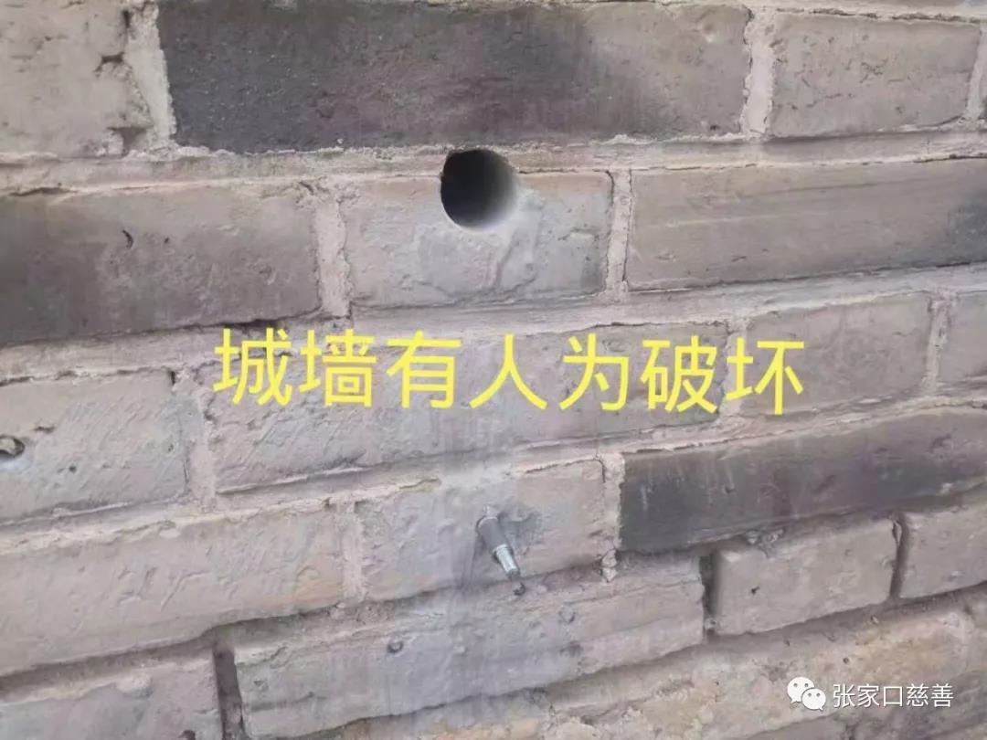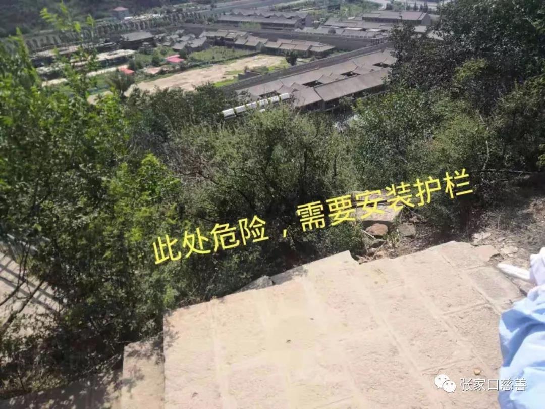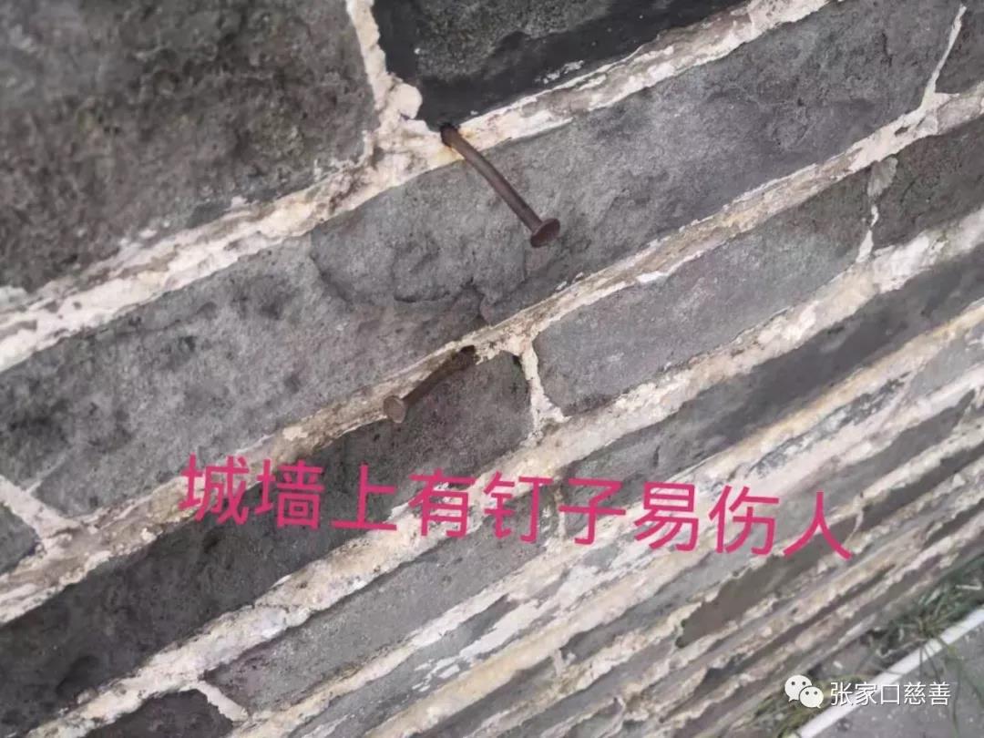 同时邀请到桥西区应急管理局大境门中队的工作人员带领我们一路仔细排查,发现路面下水井盖有拱起的、有断裂的,有人经过时容易绊倒摔伤。接下来查到大境门城墙下有电线裸露,如果触电将是很危险的事情。古城墙上有铁钉容易划伤游人。这些安全隐患不容小视。还有在城墙上人为的打眼,不知是什么情况,而且垃圾分类箱也相对较少。大家一路排查,走到烽火台的拐弯处。发现没有防护栅栏,游人走下来时容易发生危险。
