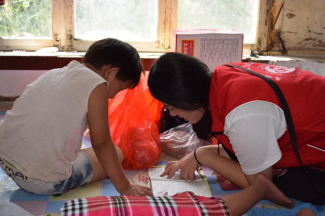 无奈的生活给了他们太多的摧残,孩子看上去是那样懦弱、自卑,不敢见生人,不敢说话,悄悄的躲进了角落,志愿者把吃的一点点递到孩子手里,与他们慢慢接触,孩子的脸上渐渐有了笑容,还给了志愿者一个久久不愿分开的拥抱。“孩子胆小,怕见陌生人,也不敢说话,就看见你们穿红坎肩的,还敢说几句”爸爸说。