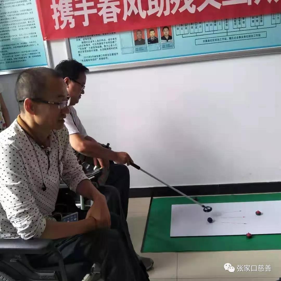 2019年8月23日下午二点,张家口肢协副主席刘俊琴携手张家口春风助残义工队的帅哥美女们和残疾人李清雨、闫志军、刘海霞等十几位一起在桥东区红旗楼南社区东麓苑小区工作室《残友之家》互动冰壶球、五子棋和飞镖活动。