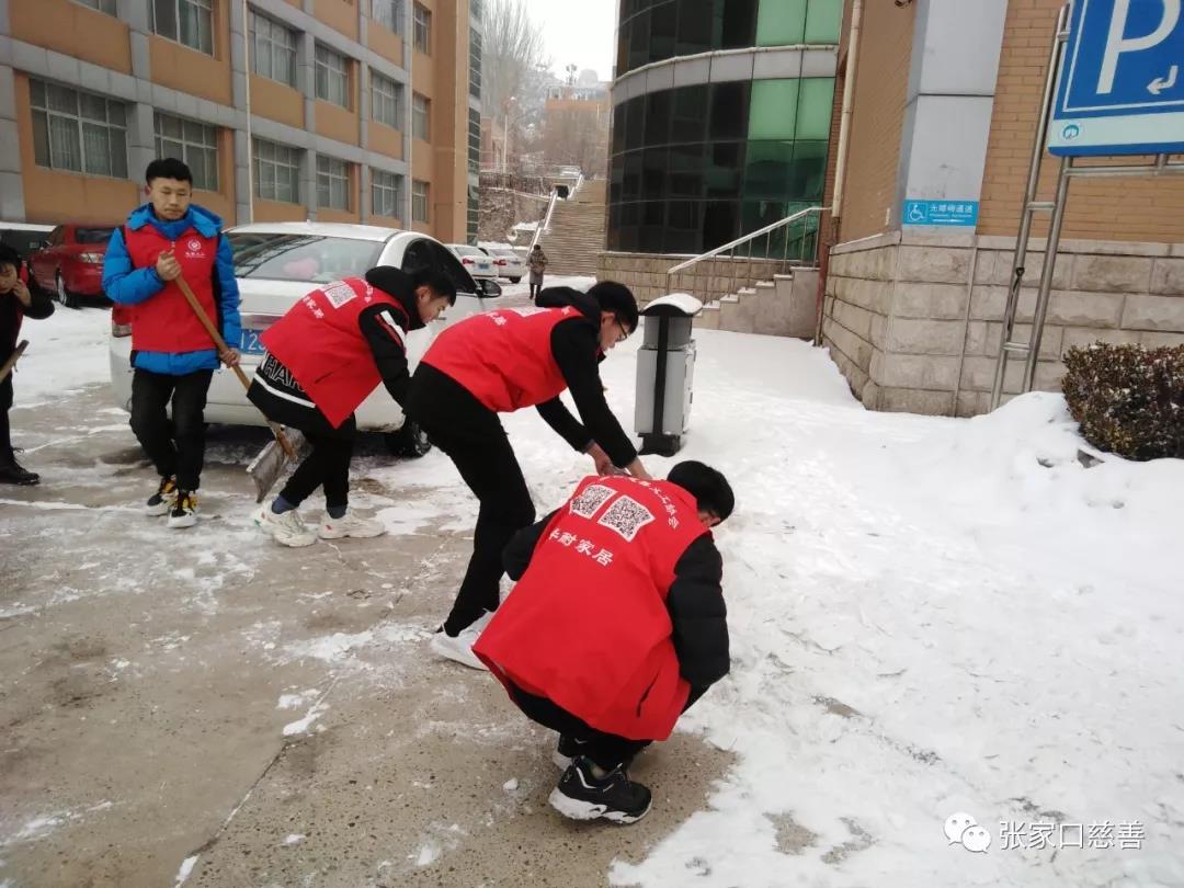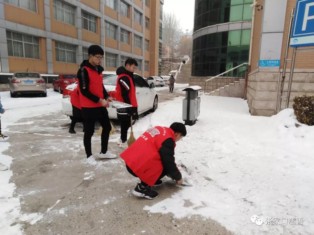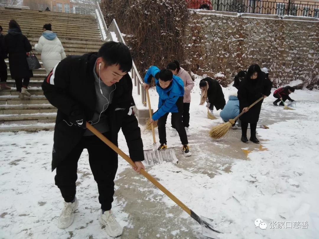 保证道路畅通,在12月16日上午九点半到下午两点,张家口大学生医学志愿者服务队带领15位队员组织了一场校园扫雪活动。各位队员顶风冒雪,不畏严寒,男生挥着铁锹用力铲开地面被踩实的层层白雪,女生在后边认真细致的将雪清扫干净,由于工具不足,部分队员们甚至用拖布清扫积雪。在扫雪过程中,欢笑洋溢在每位队员的脸上!