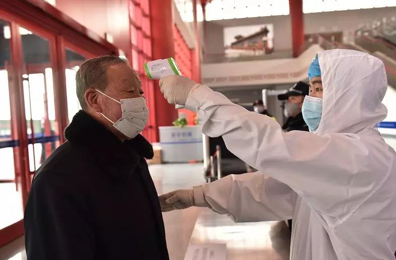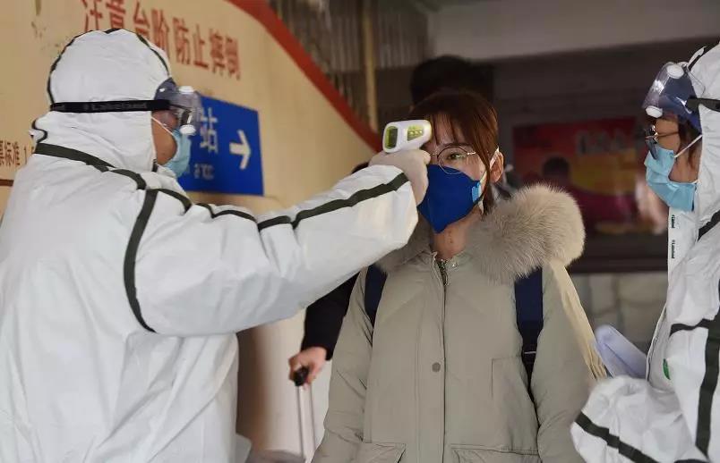 1月27日,宣化区医院医务人员在中国铁路北京局集团有限公司宣化站为进站旅客测体温。(张家口市新闻中心融媒体记者梁涛通讯员陈晓东 王玮 摄)