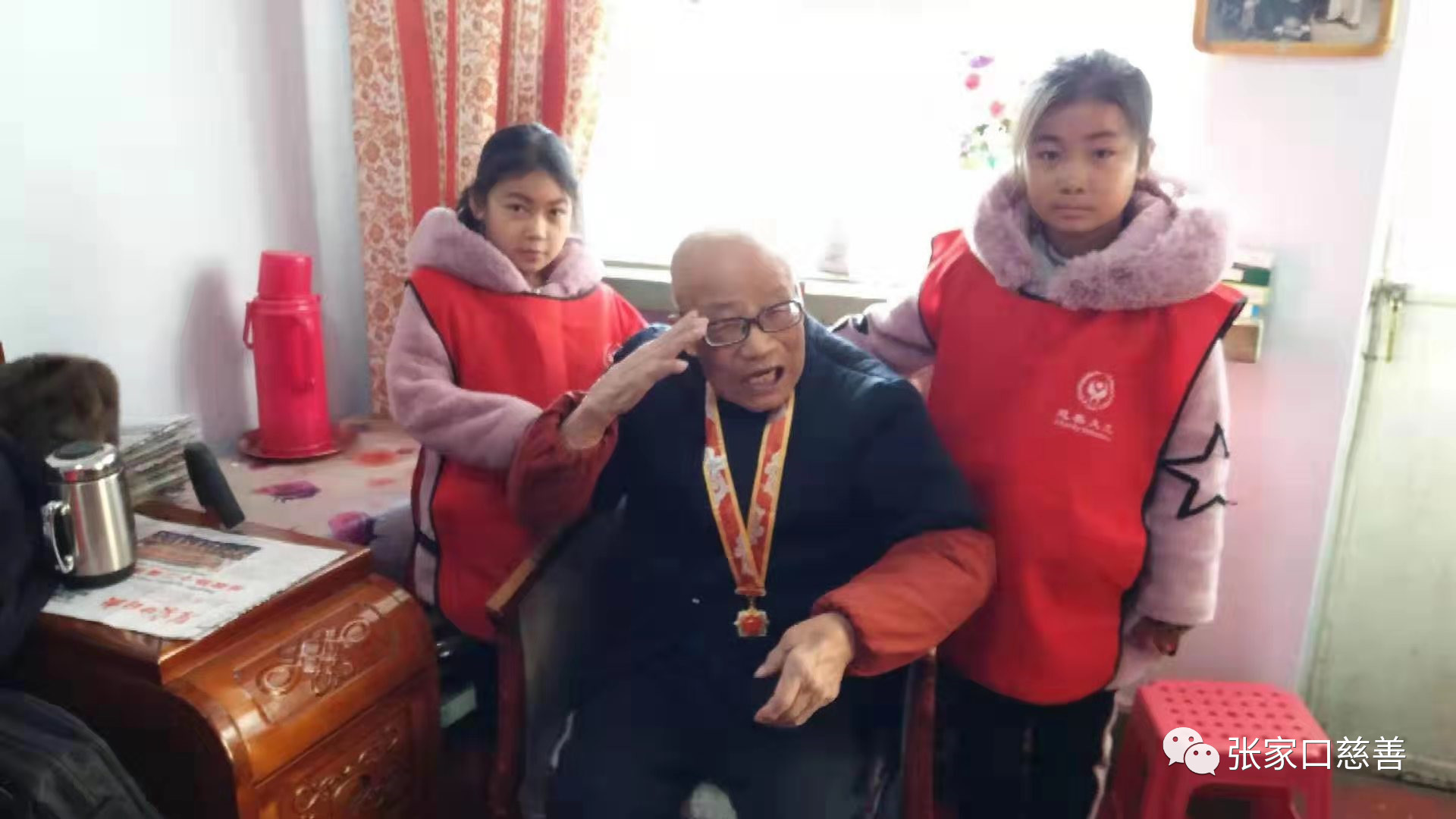 一同参加慰问的2名小志愿者感受着这温情的时刻,希望她们珍惜幸福、懂得感恩,将爱延续。临别,志愿者们为李老敬上一个庄严的军礼,向他致敬!感恩他们浴血奋战、流血牺牲为我们换来今天的幸福生活。面对久违的敬礼,李老激动了,颤抖的举起手为大家回礼。感染了现场的每一位志愿者。祝福李老开心!幸福!健康!长寿!