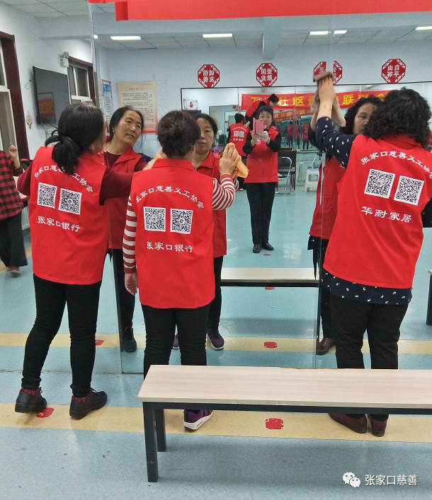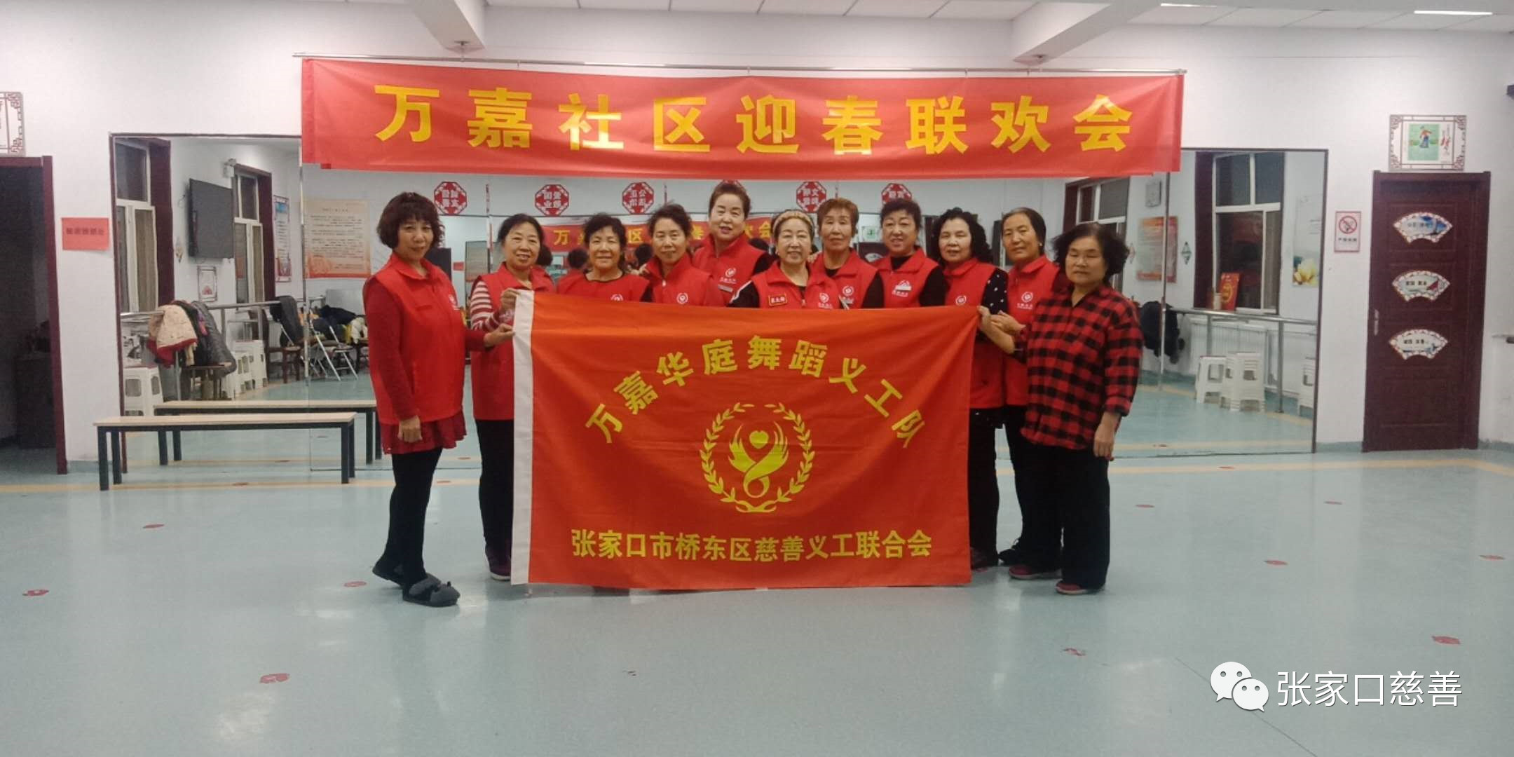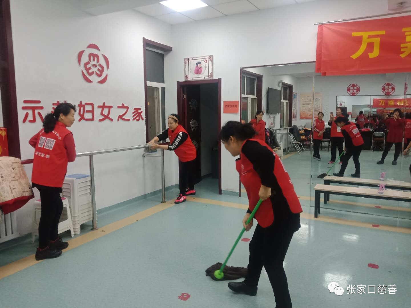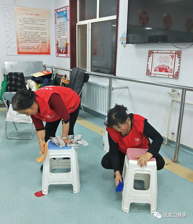 2020年1月13日晚七点半,桥东区慈善义工联合会万嘉华庭舞蹈队的志愿者们由队长冀生梅带领崔荣霞、李润香、张金兰、刘素英、杨秀琳、赵梅、高智会、康跃新、张淑珍、温俊芳、焉晓焜一行12人,自发的组织清理万嘉社区活动室的一切设施卫生,大家都从家里拿的抹布、水壶、鹿皮、洗洁净、钢纱球等用具简单做了分工。有的擦室内墙壁大水银镜,有的擦窗户玻璃,有的扫地、拖地、擦桌椅、板凳、暖气片、单杠、水池等一切活动室的设施。