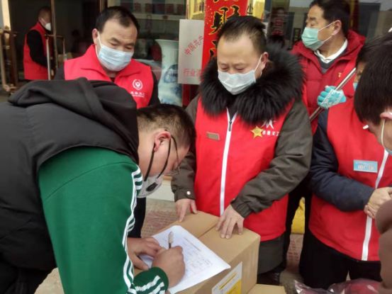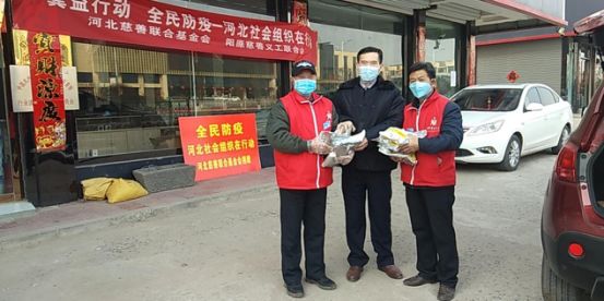 阳原工作站(阳原慈善义工联合会)所领取物资,一部分由阳原县委防控办代发到每个乡镇村、单位的一线人员手中,另一部分由爱心志愿者奔赴各乡村、各个路口为执勤人员发放。