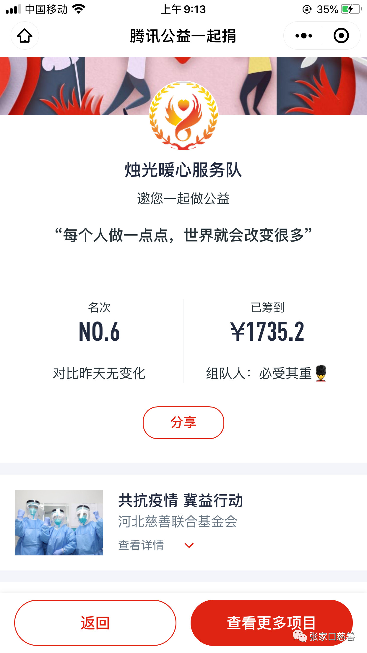 当“烛光暖心”志愿者团队得知河北慈善联合基金会张家口工作站在“腾讯公益”平台积极募捐,同时他们也一直在不分昼夜地为疫情做着工作。“烛光暖心”志愿者团队被震撼了。虽然隔离在家中,能为武汉尽一点点绵薄之力,那也是无比高兴的。 于是“烛光暖心”队在队长高泰的带动下,带头募捐,一元、两元、五元……爱心的传递就像一条美丽的项链,串起信息系一位位学子的爱心,在为疫情尽一点点绵薄之力的同时,也点亮自己。