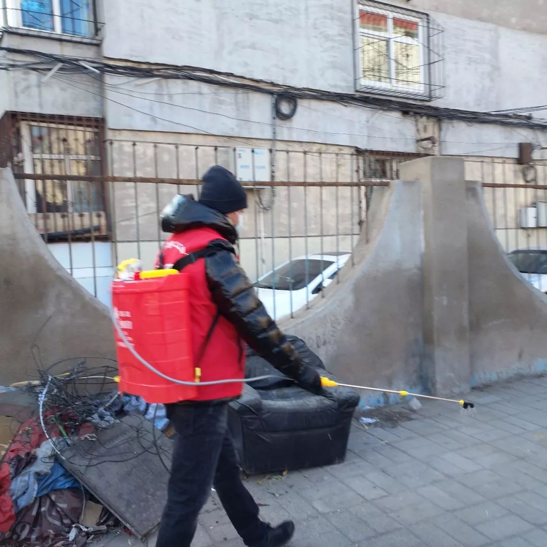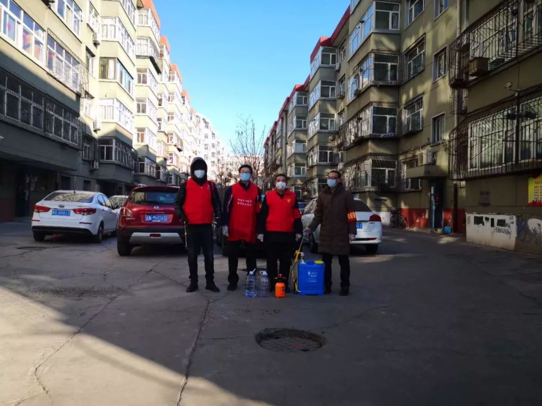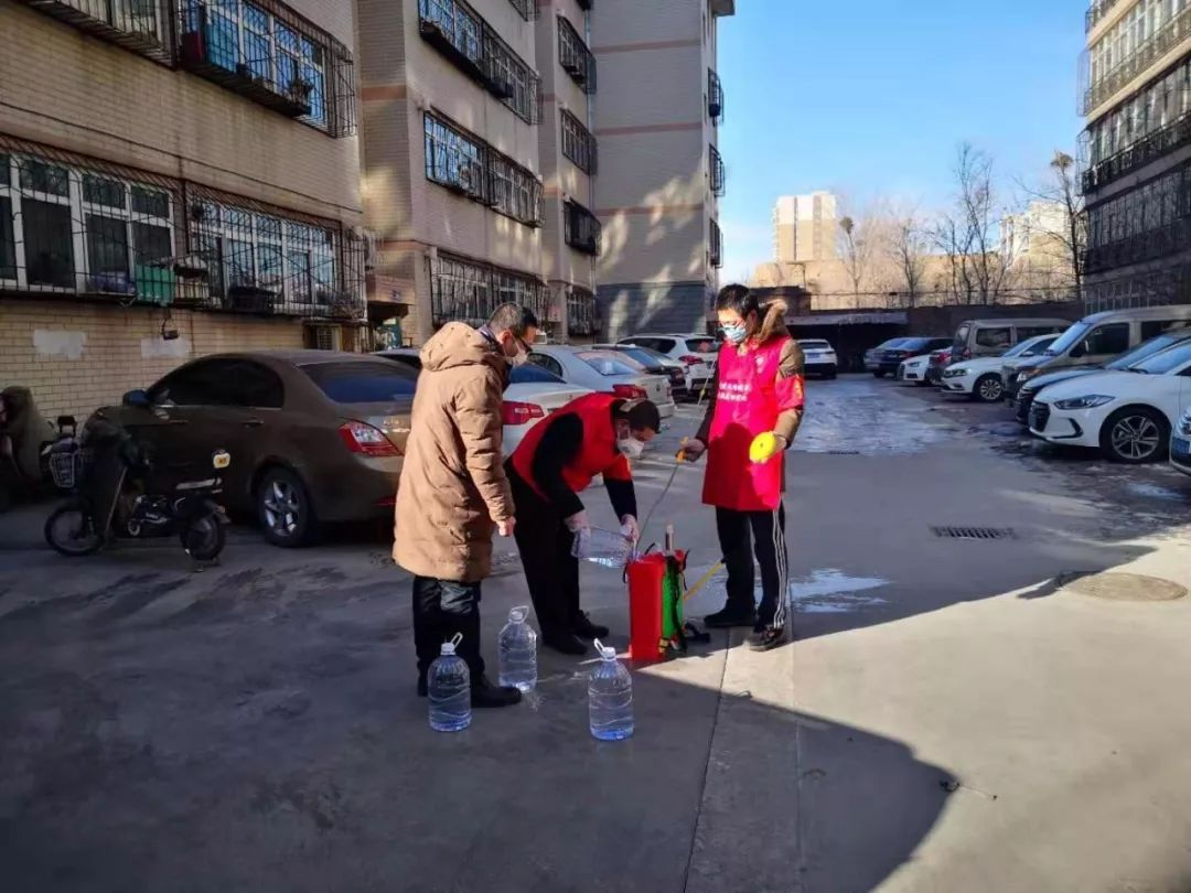 志愿者在小区院落内喷洒消毒液,进行消杀作业。