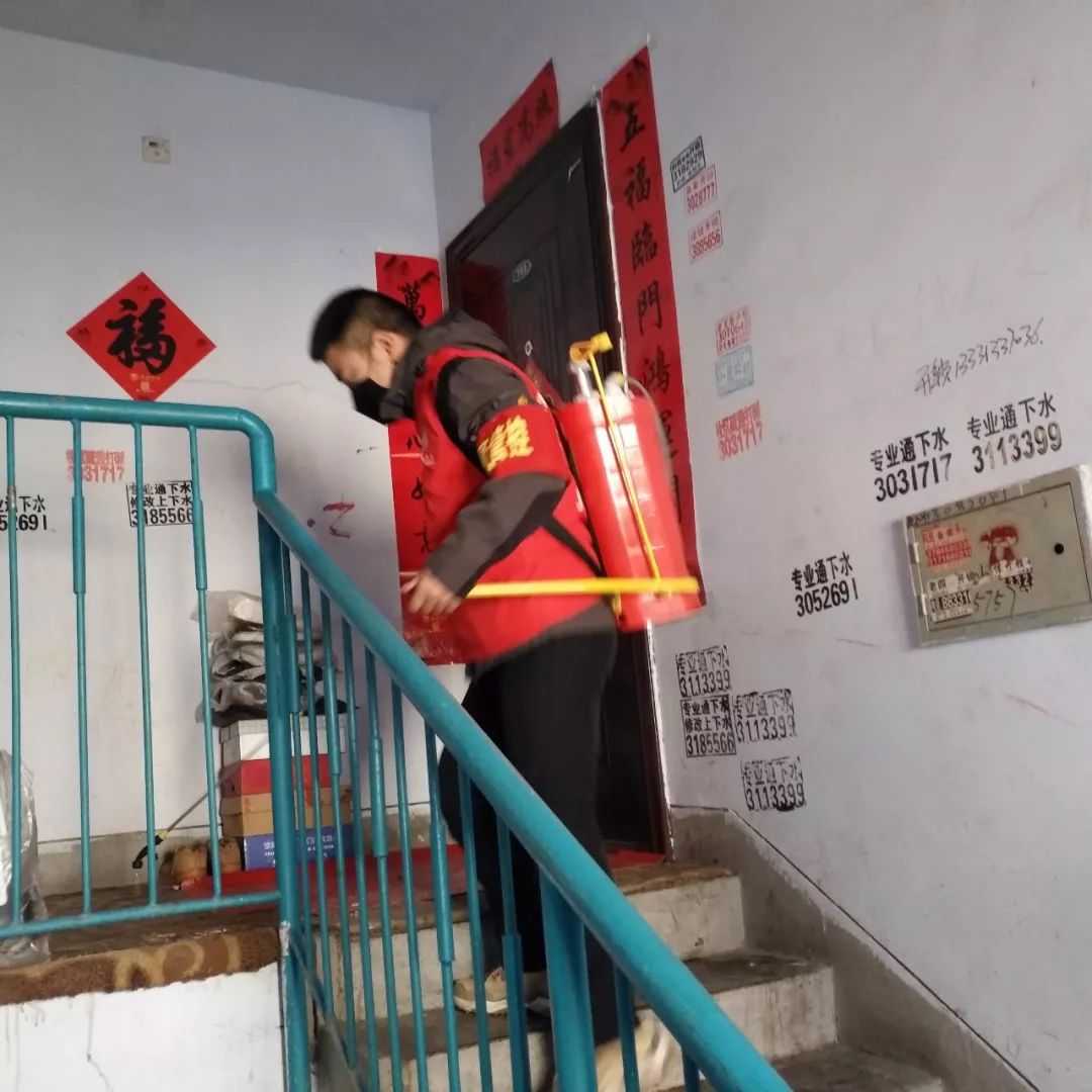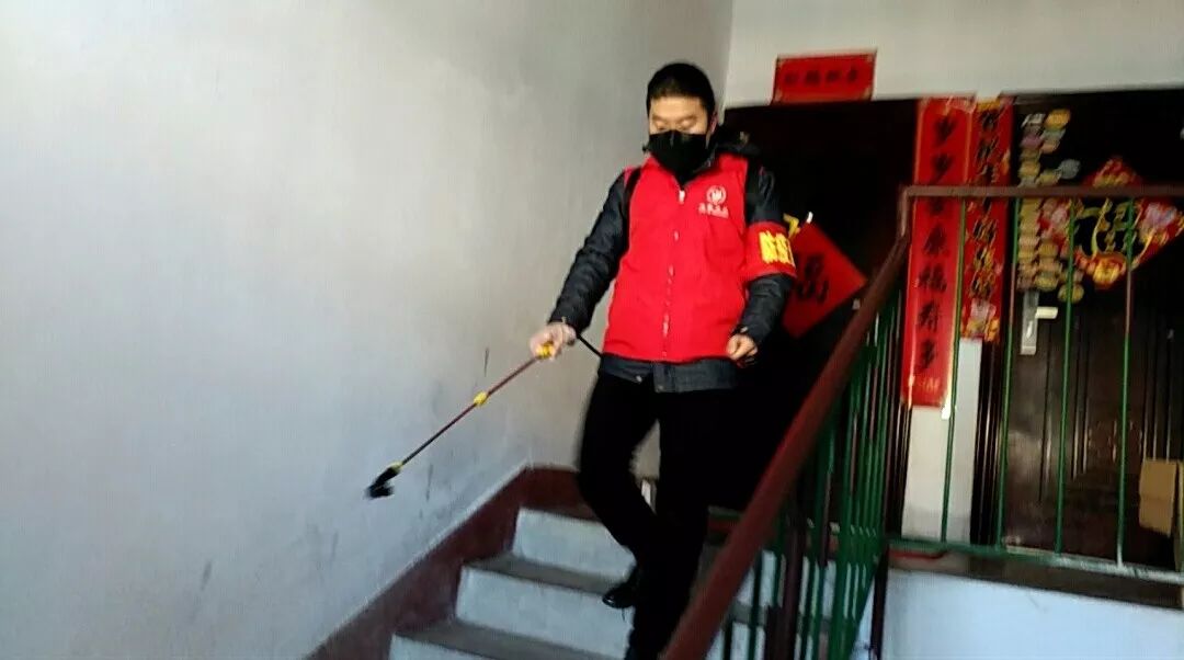 志愿者在楼道内喷洒消毒液,进行消杀作业。