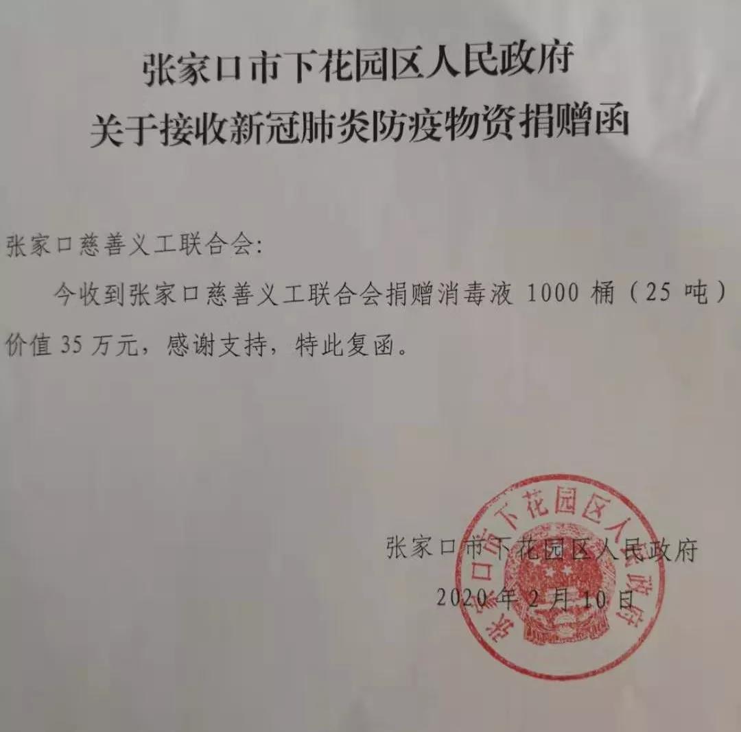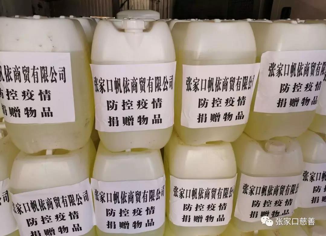 2020年2月10日,张家口慈善义工联合会携手张家口帆依商贸有限公司,为下花园区政府捐赠价值35万元的消毒液1000桶(重25吨)用于新型冠状病毒肺炎的防治。通过与张飞董事长交流了解到,从疫情发生以来,他一直密切关注疫情防控形势,通过多方努力筹集采购防护物资送给在一线坚守岗位的工作人员,希望能为疫情防控尽一份绵薄之力。