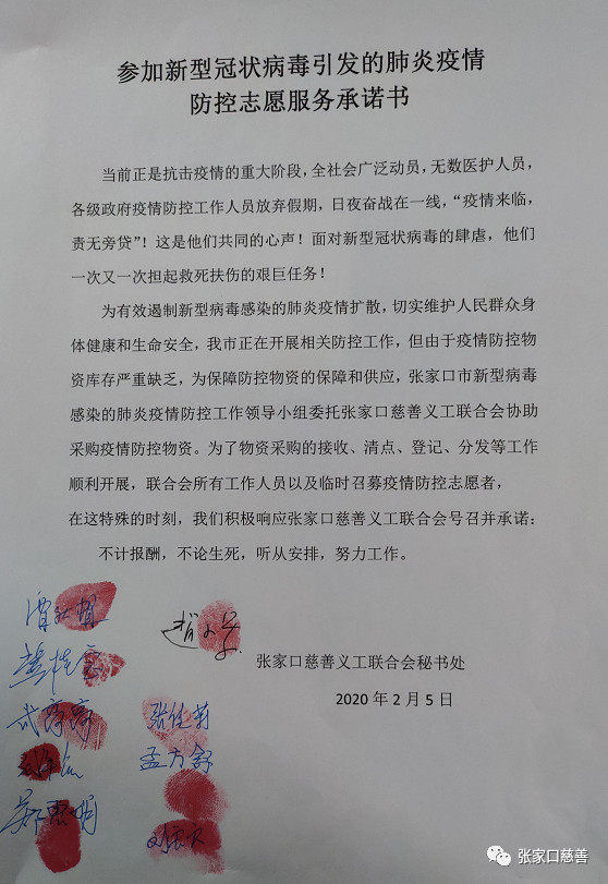 张家口慈善义工联合会接到“张家口新型冠状病毒肺炎疫情防控工作领导小组办公室”的安排,委托张家口慈善义工联合会统一接收、整理张家口工商联(总商会)所有民营企业为此次疫情防控的捐款、捐物,同时为疫情防控工作应急协调、调配防控物资,配合张家口红十字会、国药乐仁堂张家口分公司开始从全国各地、世界各地各种渠道为张家口疫情防控工作调集疫情防控物资,按相关规定采购、接收、登记保管、分管相关物资。