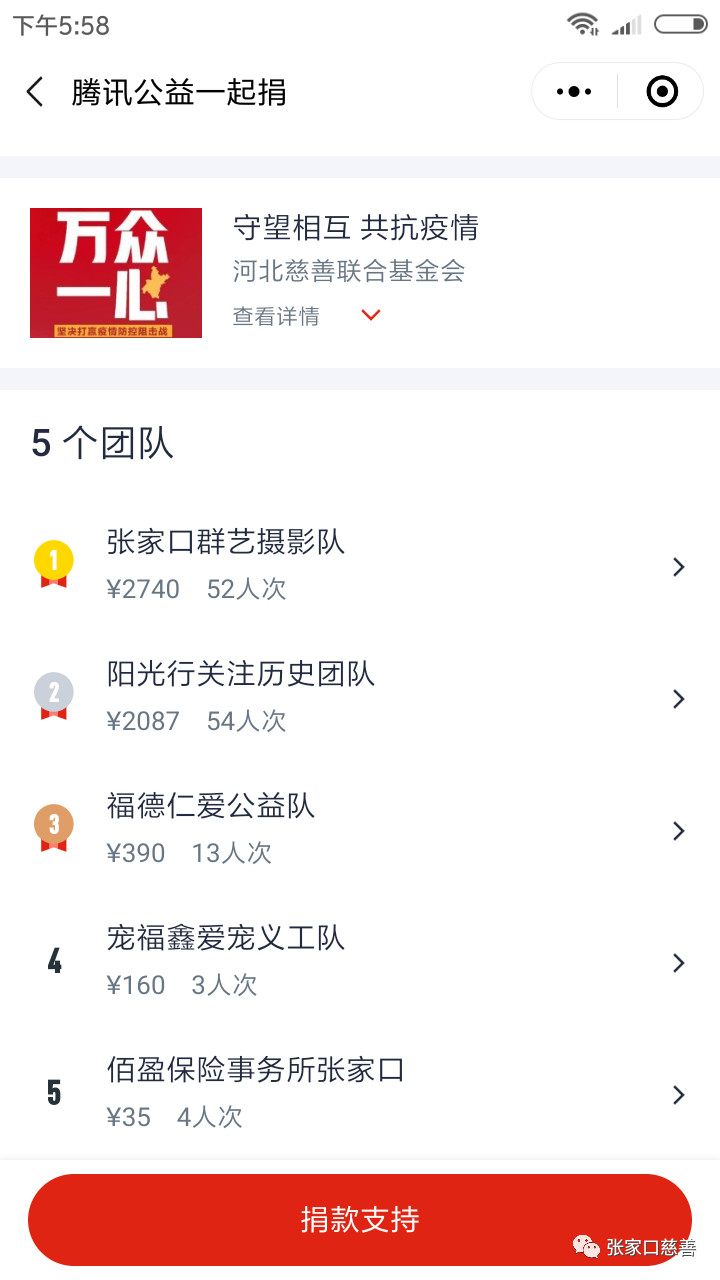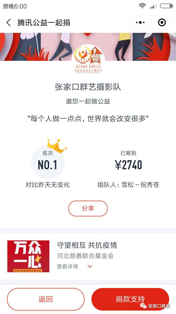在举国上下抗击新冠状病毒的关键时期,张家口群艺摄影队“守望互助,共抗疫情”。对抗击新冠状病毒同心协力,全力支援一线抗疫英雄,在短短3天时间里有38人通过微信方式捐款1980元,有的队员还两次捐款。张家口群艺摄影队在本次团队捐款中名列第一。