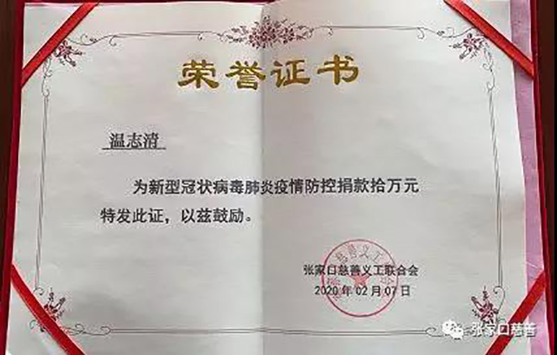 疫情就是命令,温会长将防疫工作当做自己的使命,在疫情爆发的第一时间,毅然决然地通过张家口慈善义工联合会这个平台,捐赠了10万元人民币,用于疫情期间所需物资的采购。