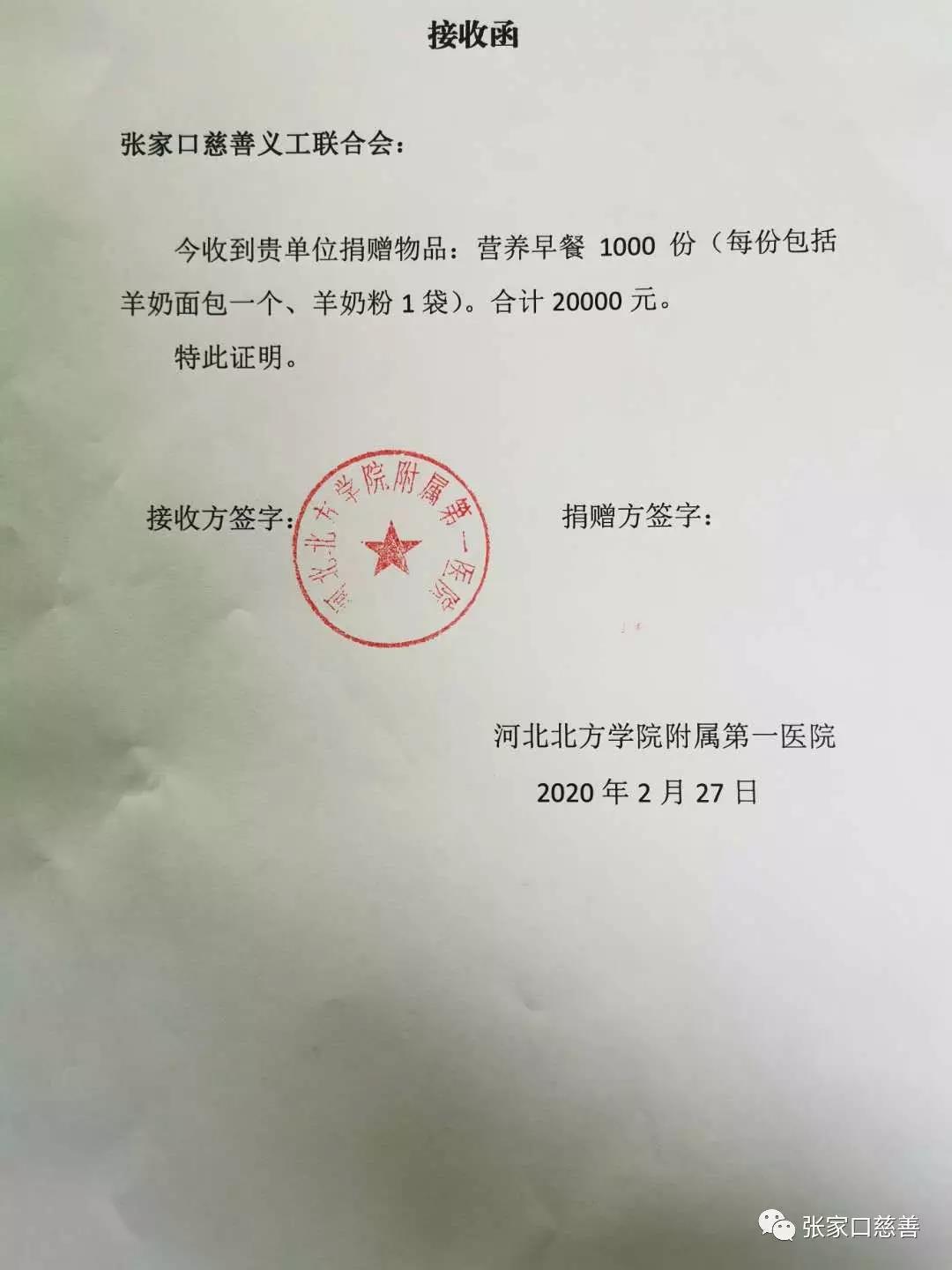 新型冠状病毒感染的肺炎疫情牵动着全国人民的心,为感谢医护人员的辛苦付出,2020年2月27日上午,张家口慈善义工联合会携手张家口康垣宜养科技有限公司,张家口慈善义工联合会党委副书记冀桂宝、双工发展专委会张喜梅会长、双工发展专委会副会长孟富参加捐赠仪式,副会长孟富为河北北方学院附属第一医院捐赠了羊奶营养早餐(羊奶粉、羊奶面包)1000份,合计人民币20000元,用于支持医院抗击疫情工作。